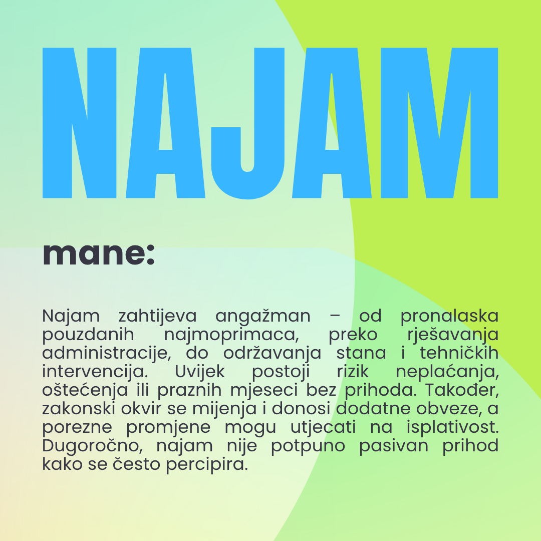 Kupci se često usredotoče na raspored prostorija ili na izgled namještaja, dok zanemaruju detalje koji dugoročno imaju puno veći značaj: stanje prozora i instalacija, buka izvana, orijentacija stana, održavanje zgrade ili potencijalni troškovi adaptacije. Tek kada se sve te stvari sagledaju zajedno, moguće je donijeti dobru odluku.