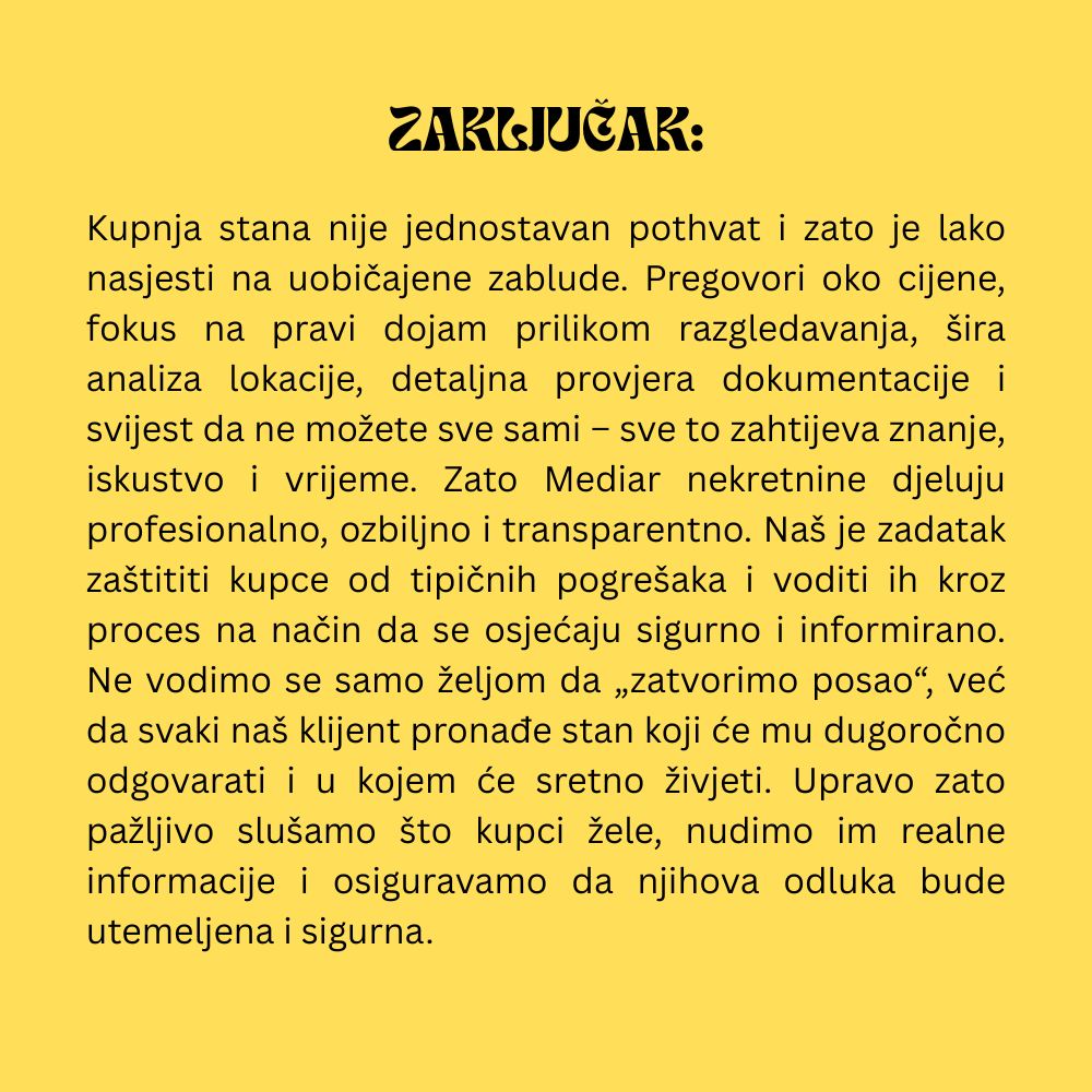 Kupnja stana za većinu ljudi predstavlja jednu od najvećih i najvažnijih životnih odluka. To je ulaganje koje se ne radi često i upravo zato ga prate snažne emocije, puno iščekivanja, ali i niz uvriježenih mišljenja koja ne moraju uvijek biti točna. Internet forumi, savjeti prijatelja ili susjeda te mitovi koji godinama kruže stvaraju zablude koje mogu ozbiljno utjecati na proces kupnje.