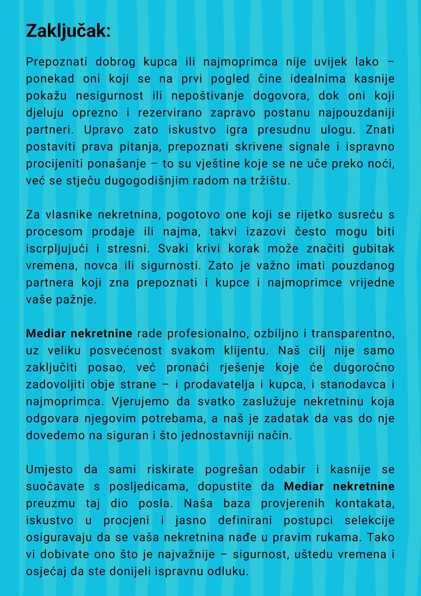 No, stvarnost je puno složenija. Nekretnine nisu obična roba i iza svake stoji niz pravnih, financijskih i praktičnih pitanja. Kupac koji sam ulazi u postupak često izgubi jako puno vremena, previdi pravne rizike, ne zna prepoznati realnu vrijednost stana ili u pregovorima plati više nego što bi trebao. I ono najvažnije – u ovom procesu nema mjesta za pogreške, jer se radi o stotinama tisuća eura i dugoročnim životnim odlukama.
