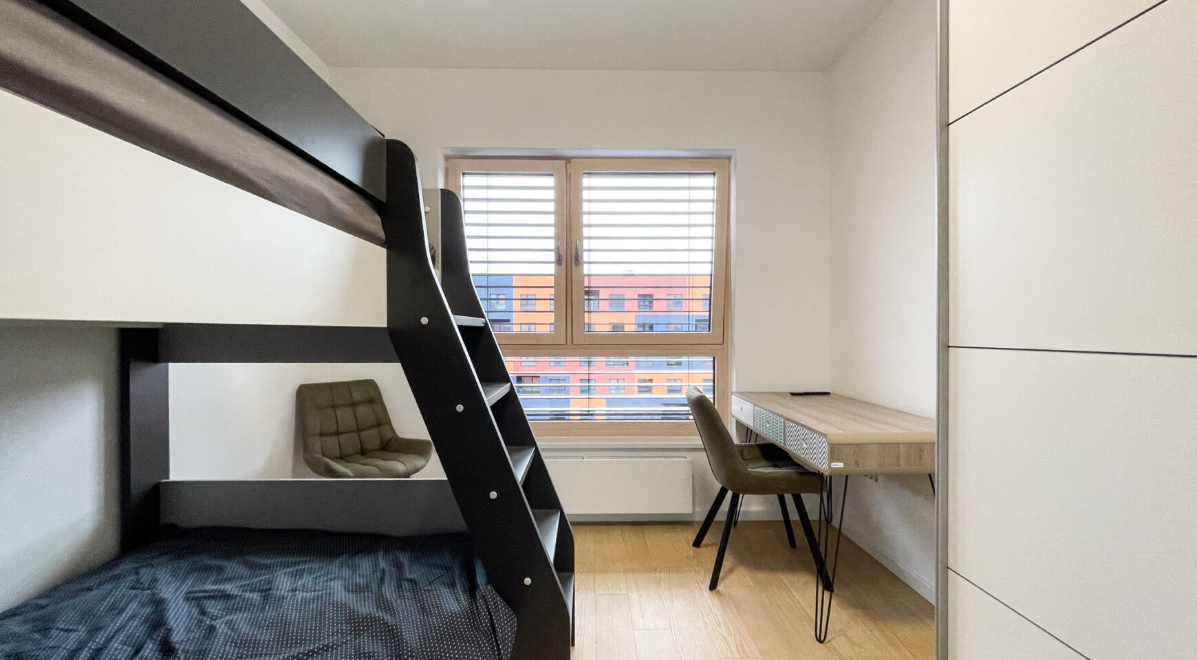 Stan ima površinu od 70m2, a sastoji se od ulaznog prostora, dvije kupaonice (prva je opremljena tuš kadom, umivaonikom i wc-om, dok je druga opremljena kadom, wc-om, perilicom i sušilicom rublja i umivaonikom), kuhinje s blagavaonicom i dnevnim boravkom, dvije spavaće sobe i lođe.