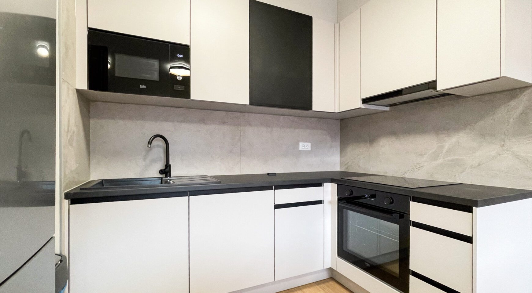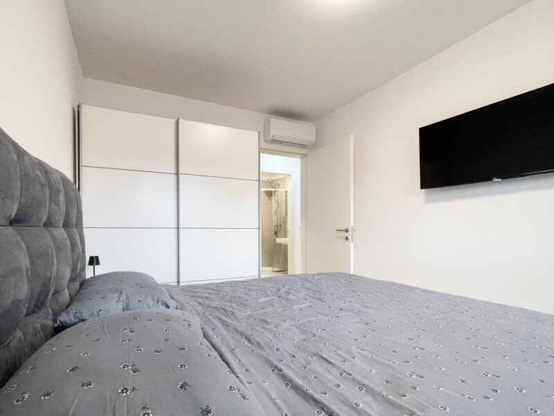 Stan je kompletno opremljen svim uređajima koje podrazumijeva novogradnja: klima, PVC stolarija, protuprovalna vrata, električne rolete, video portafon. Kuhinja je opremljena svim potrebnim kuhinjskim elementima koji dolaze s pećnicom, napom, perilicom posuđa i hladnjakom.