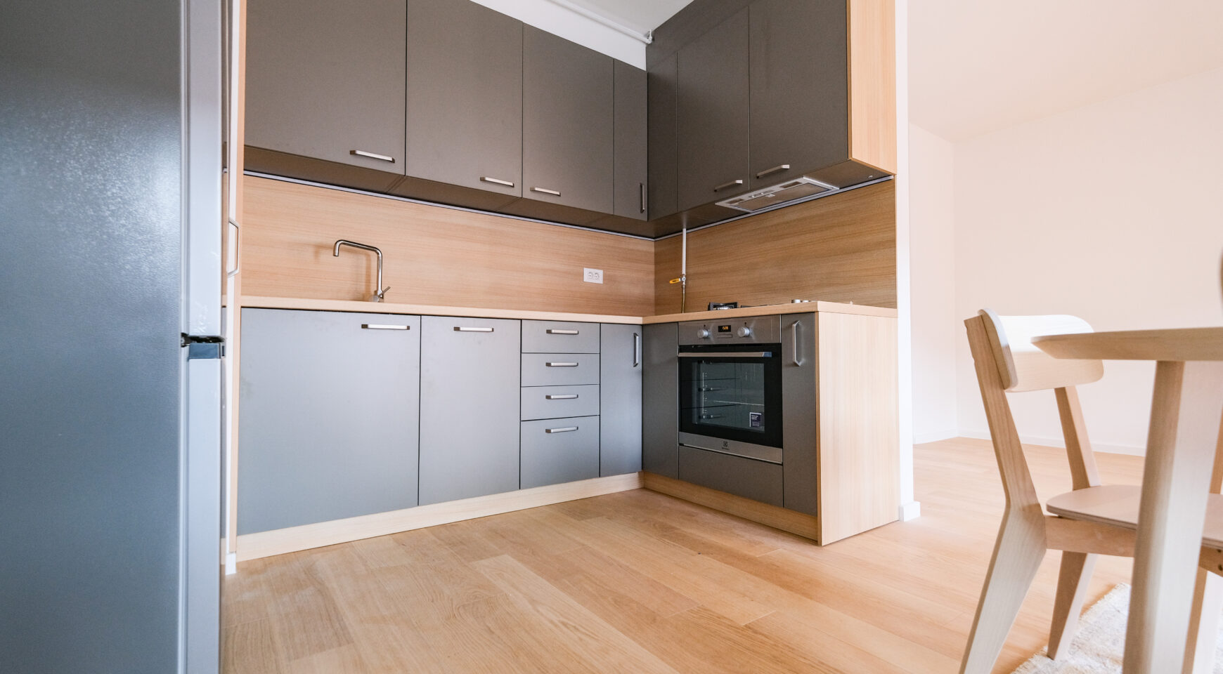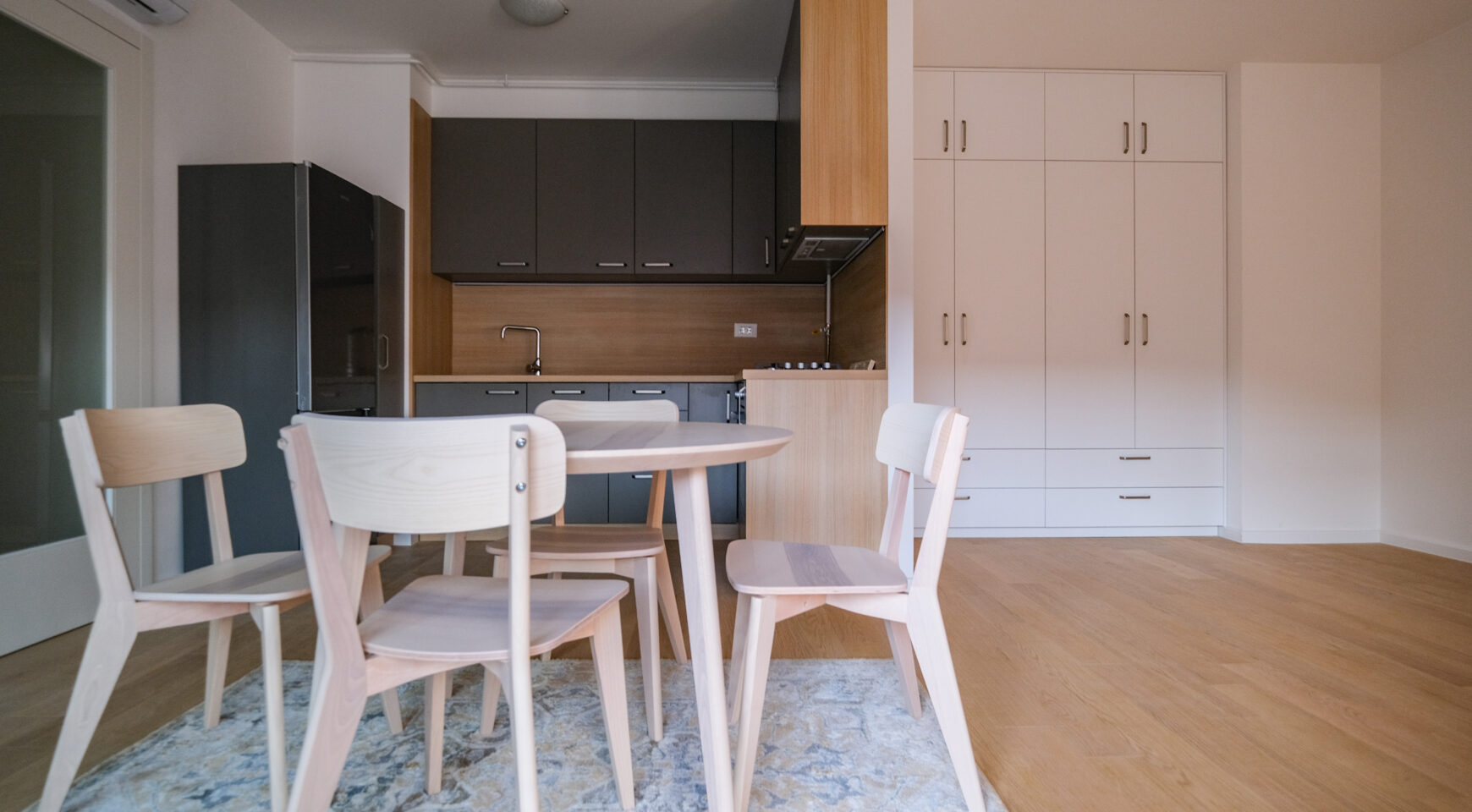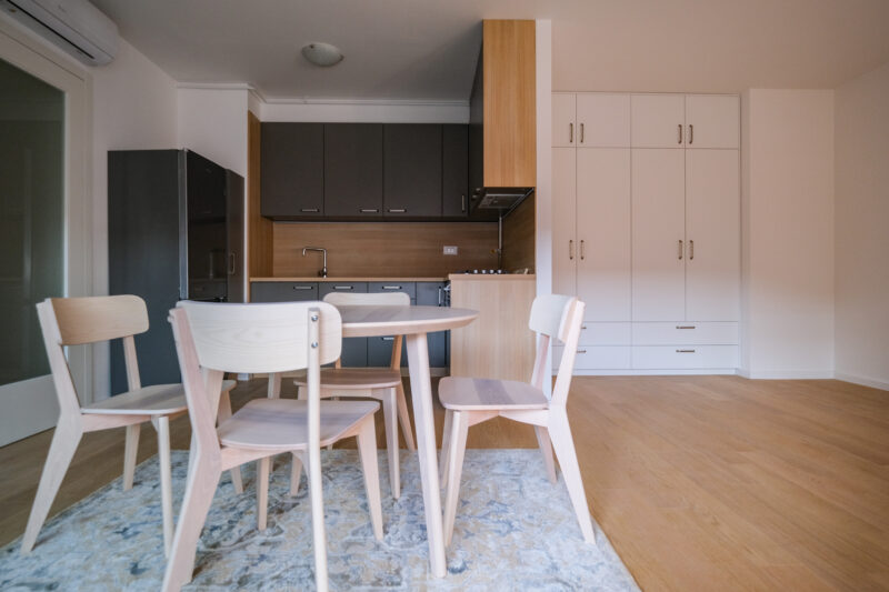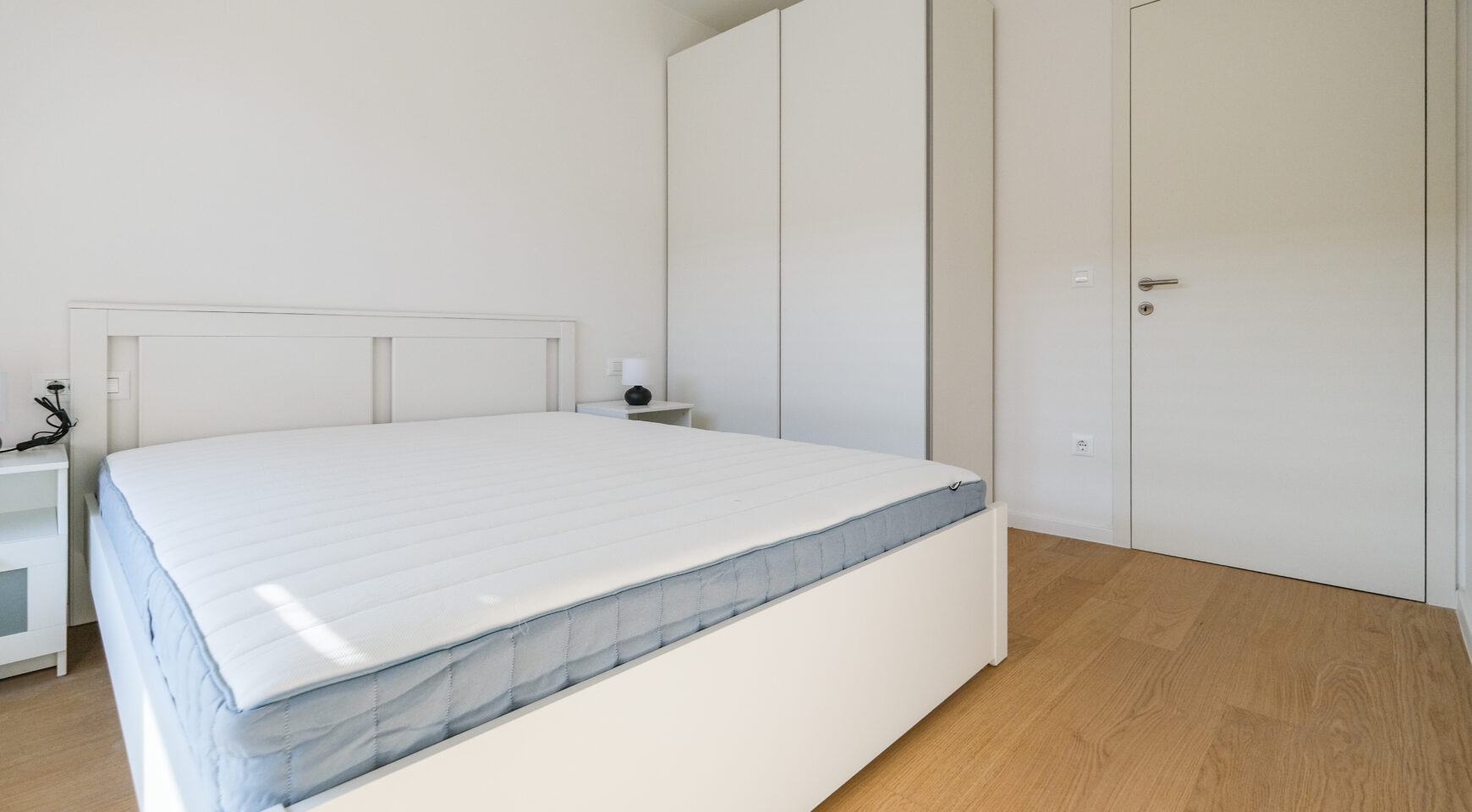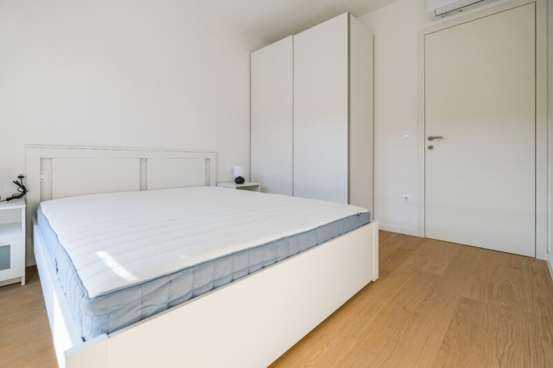 Južne je orijentacije, moderno i minimalistički organiziran i sastoji se od dnevnog boravka s kuhinjom i blagovaonicom, dvije spavaće sobe, dvije kupaonice (jedna s tušem, druga s kadom), te lođe koja predstavlja ugodan dodatni prostor za boravak. Kuhinja je u potpunosti opremljena modernim uređajima, a stan je namješten i spreman za useljenje.