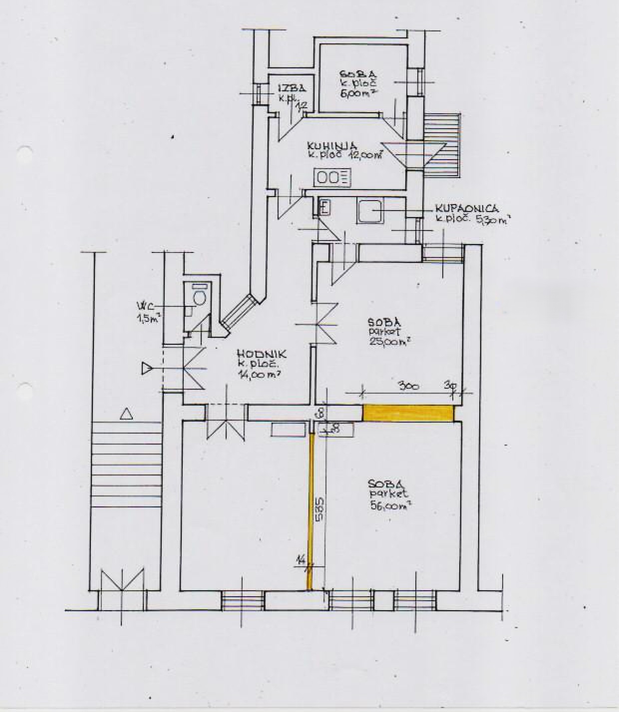 Stan se inicijalno sastojao od tri prostrane sobe i jedne manje sobe (djevojačke) te dalje, kupaonice, zasebnog toaleta, balkona te pripadajućeg spremišta. Trenutačno su tri prostrane sobe spojene u jednu (vidljivo na tlocrtu) što novom vlasniku omogućuje različite intervencije u prostoru te krojenje rasporeda prema vlastitim željama.