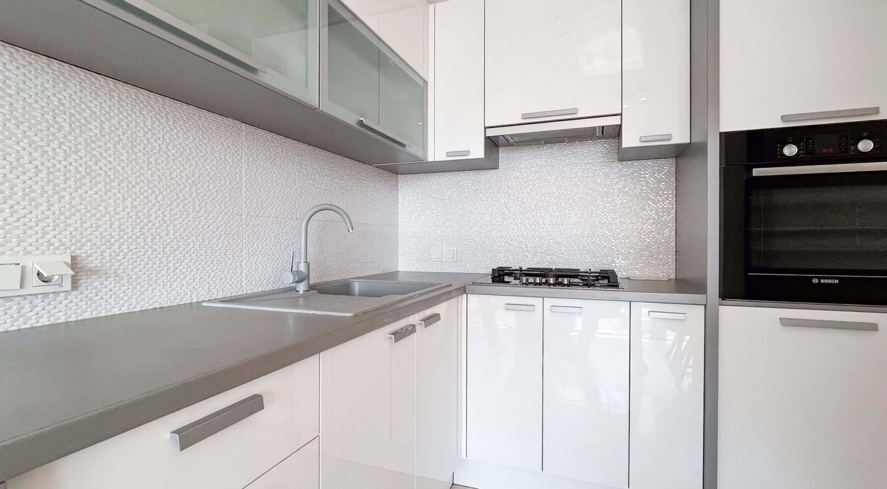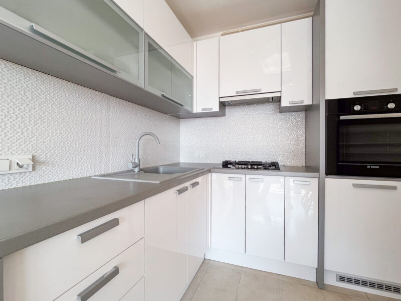 Potpuno je namješten i opremljen klima uređajem, video portafonom, perilicom posuđa, perilicom/sušilicom rublja, TV-om, hladnjakom sa zamrzivačem, pećnicom, ugradbenim ormarima, bračnim krevetom, kaučem na razvlačenje, električnim podizačima roleta u DB-u, PVC stolarijom, protuprovalnim vratima itd.