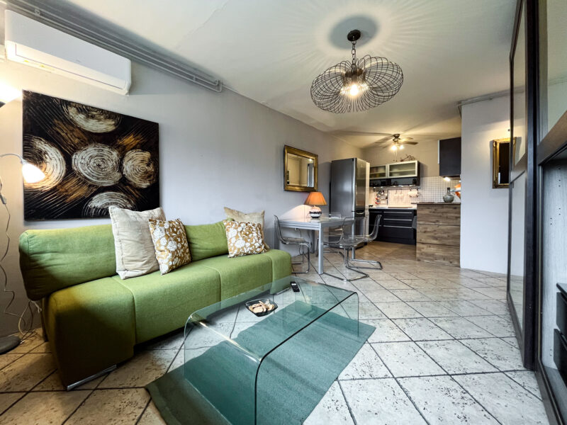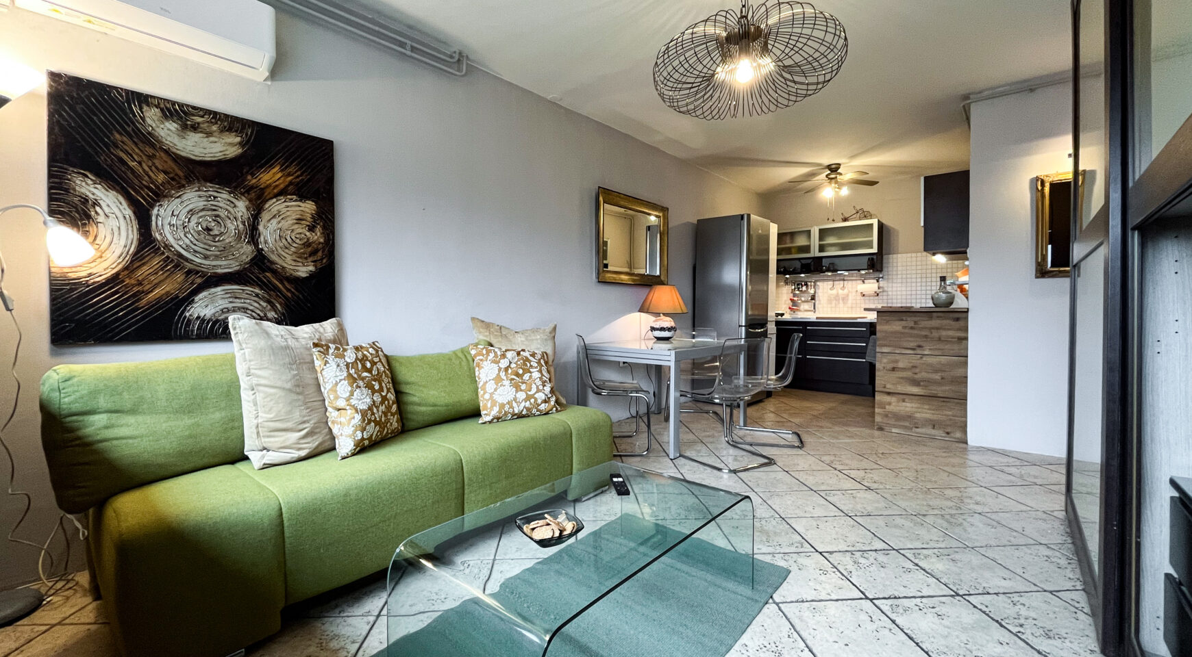 Stan je veoma svjetao i topao, a klimatiziran. Orijentiran je na južnu stranu. Površine 40 m2, a sastoji se od hodnika, dnevnog boravka s blagovaonskim dijelom, kuhinje, spavaće sobe, kupaonice te zatvorenog balkona.