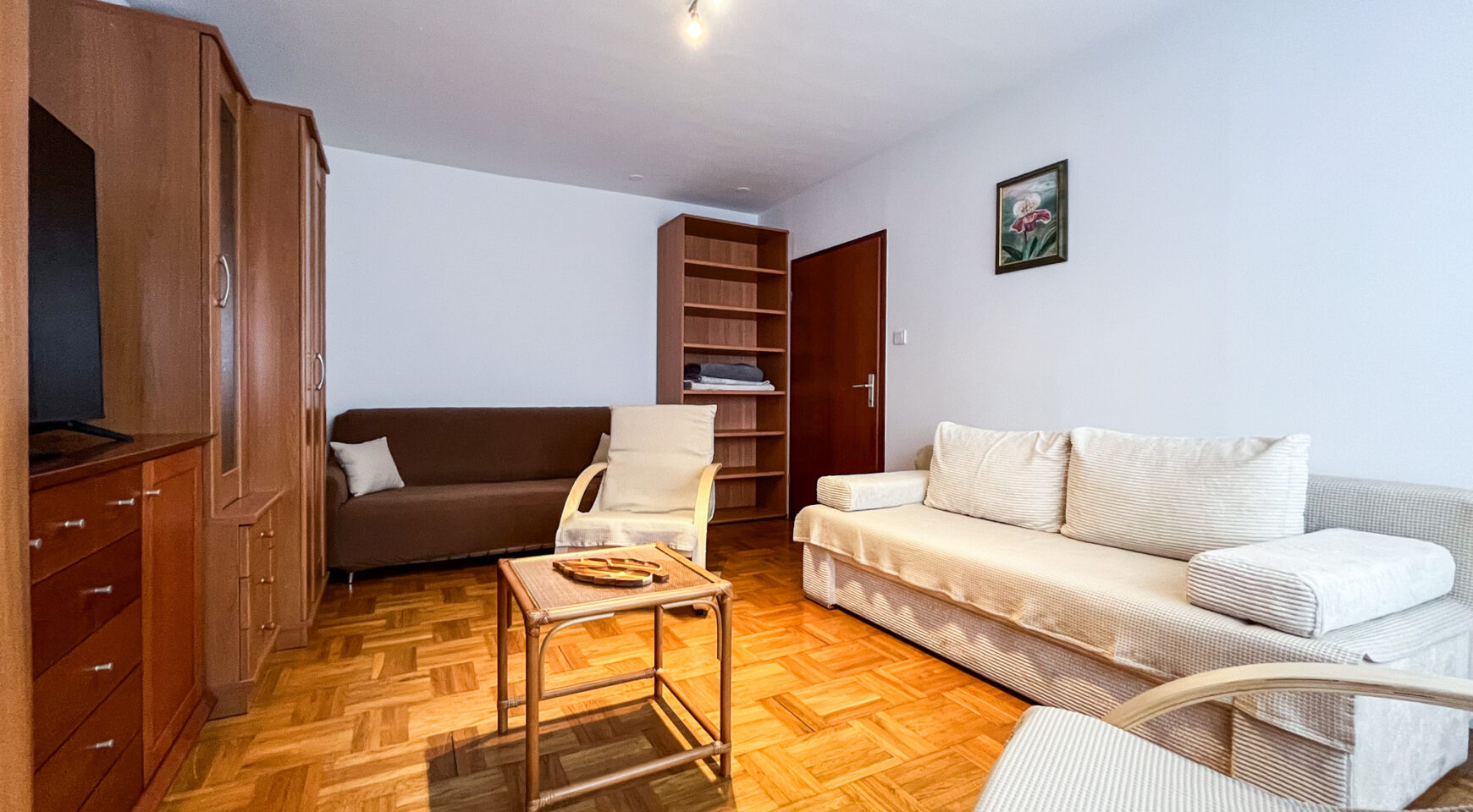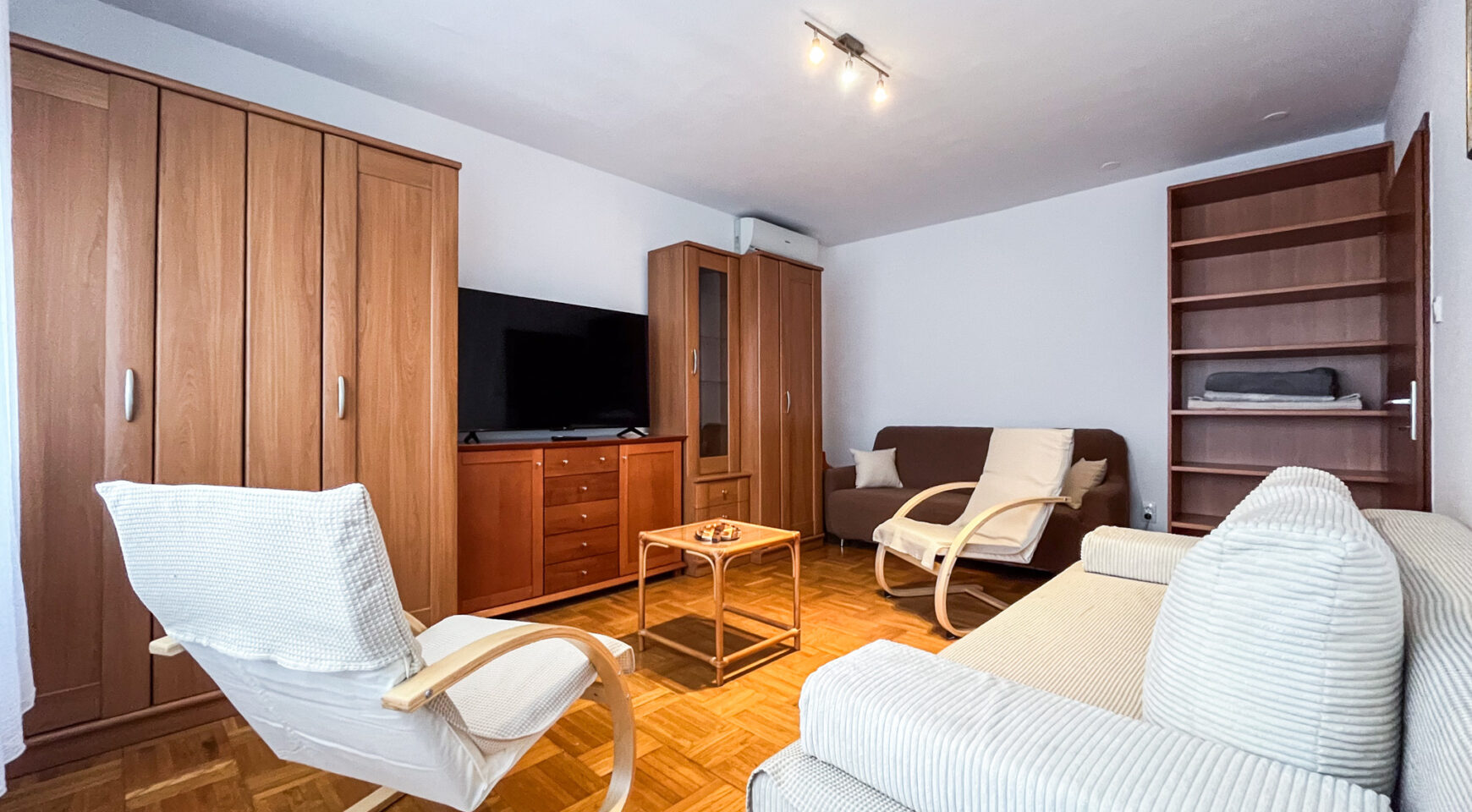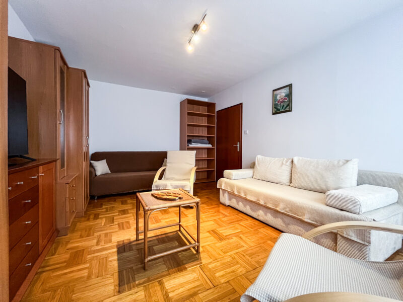 Potpuno je namješten i kao takav se iznajmljuje. Opremljen je klima uređajem, novom, perilicom rublja, tuš kabinom, novim hladnjakom, zamrzivačem, pećnicom, štednjakom 2+2, napom, radnim stolom, trosjedom i dvosjedom na razvlačenje, foteljama, bračnim krevetom, ugradbenim ormarima, protuprovalnim vratima, novom PVC stolarijom, novim TV-om, posuđem i sl.