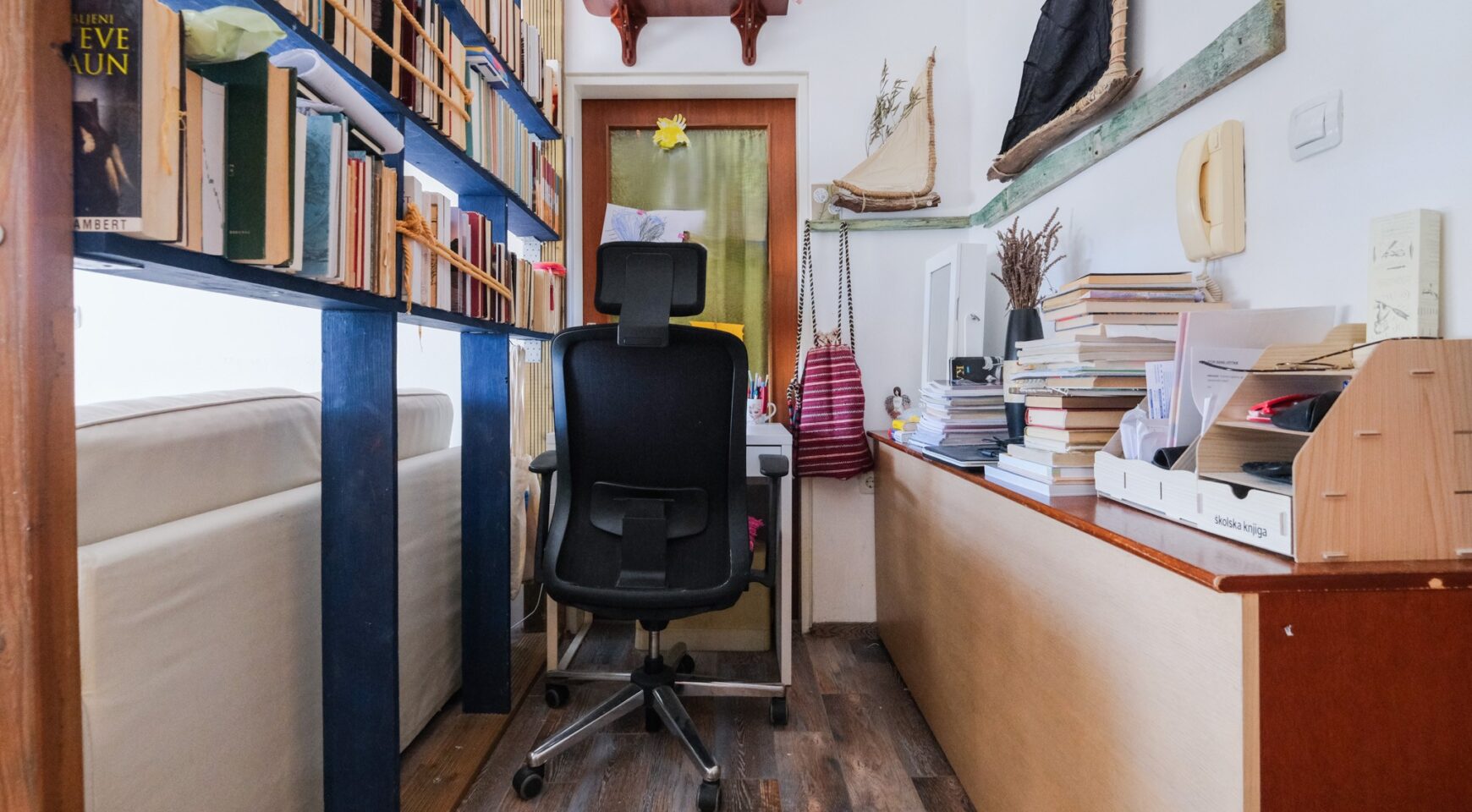 Ima površinu od 61,33 m2 i okrenut je na jug što mu osigurava dosta dnevne svjetlosti i ostavlja odličan dojam. Sastoji se od ulaznog dijela koji je pretvoren u radni dio, dnevnog boravka, dijela dnevnog boravka koji je praktično odijeljen i pretvoren u spavaći dio (vidljivo na fotografijama), kuhinje, blagovaonice, prostranog balkona, toaleta, kupaonice i spavaće sobe. Također mu pripada spremište u podrumu zgrade.