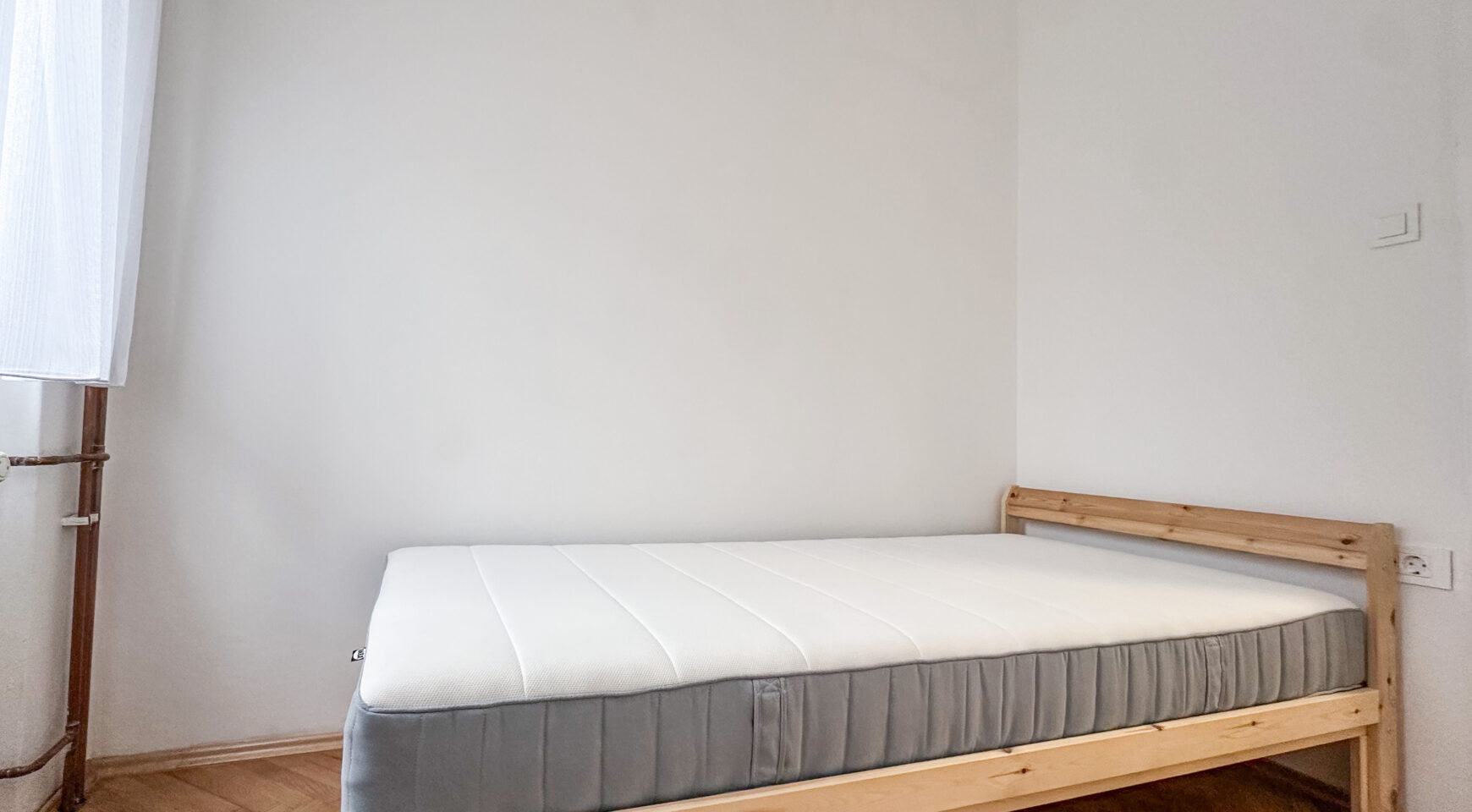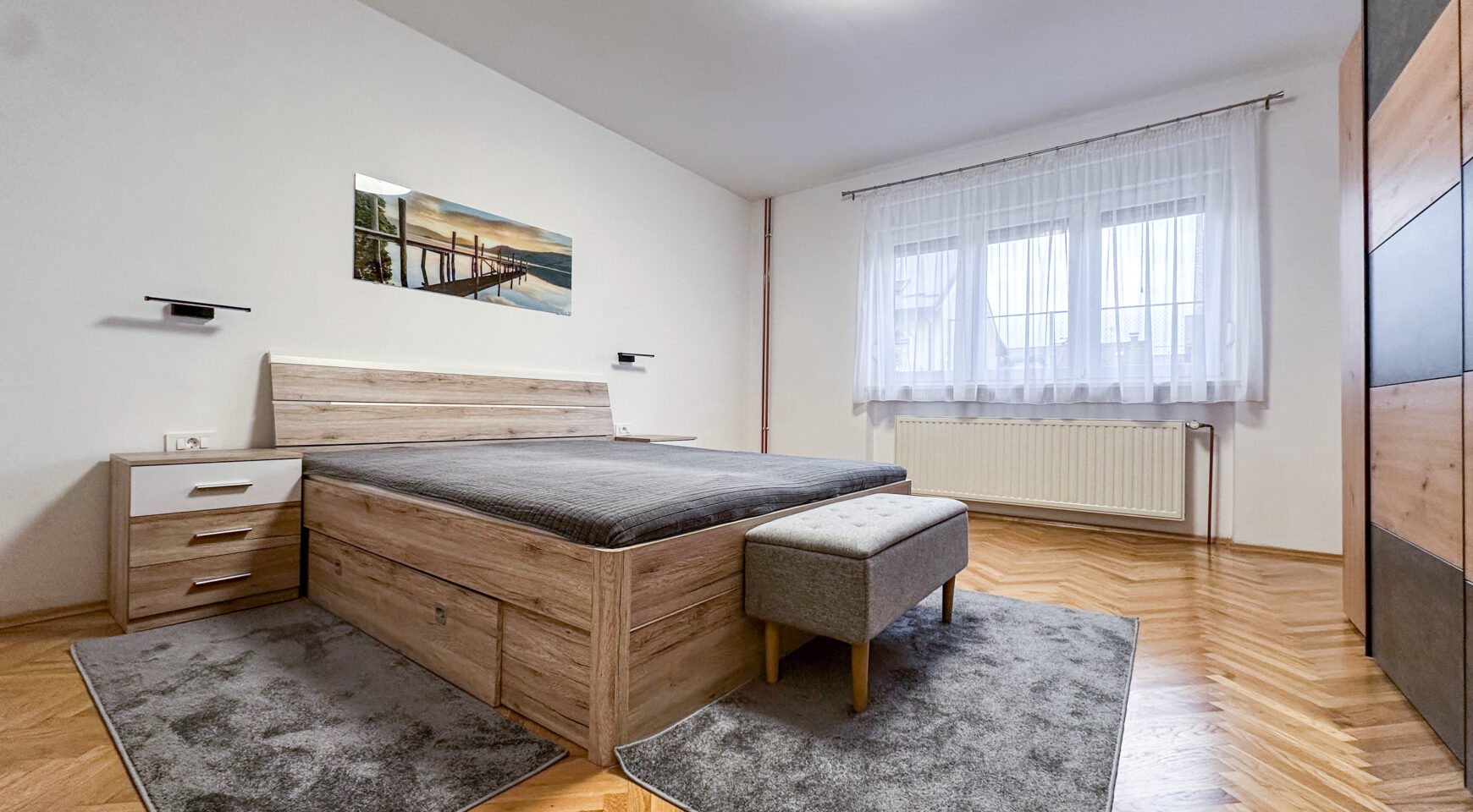 Stan se sastoji od velike spavaće sobe, dnevnog boravka , opremljene kuhinje s blagavaonskim stolom, kupaonice s podnim grijanjem te dodatne sobe (dječja ili ured). Vlasnik stana će prema potrebi najmoprimca urediti malu sobu kao ured.