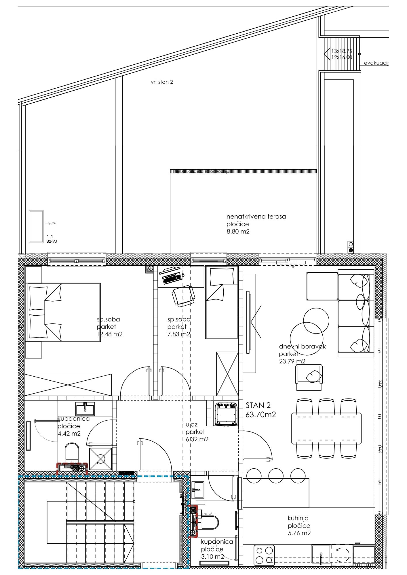 Stan oznake S2 ima zatvorenu površinu od 63,60m2 (dnevni boravak s kuhinjom, soba 1, soba 2, kupaonica 1, kupaonica 2, predsoblje), nenatkrivenu terasu od 8,8 m2 i vrt od 20 m2. Ukupna stvarna površina stana je 124,9 m2, a NKP je 79,86 m2. Tlocrt se nalazi u privitku.