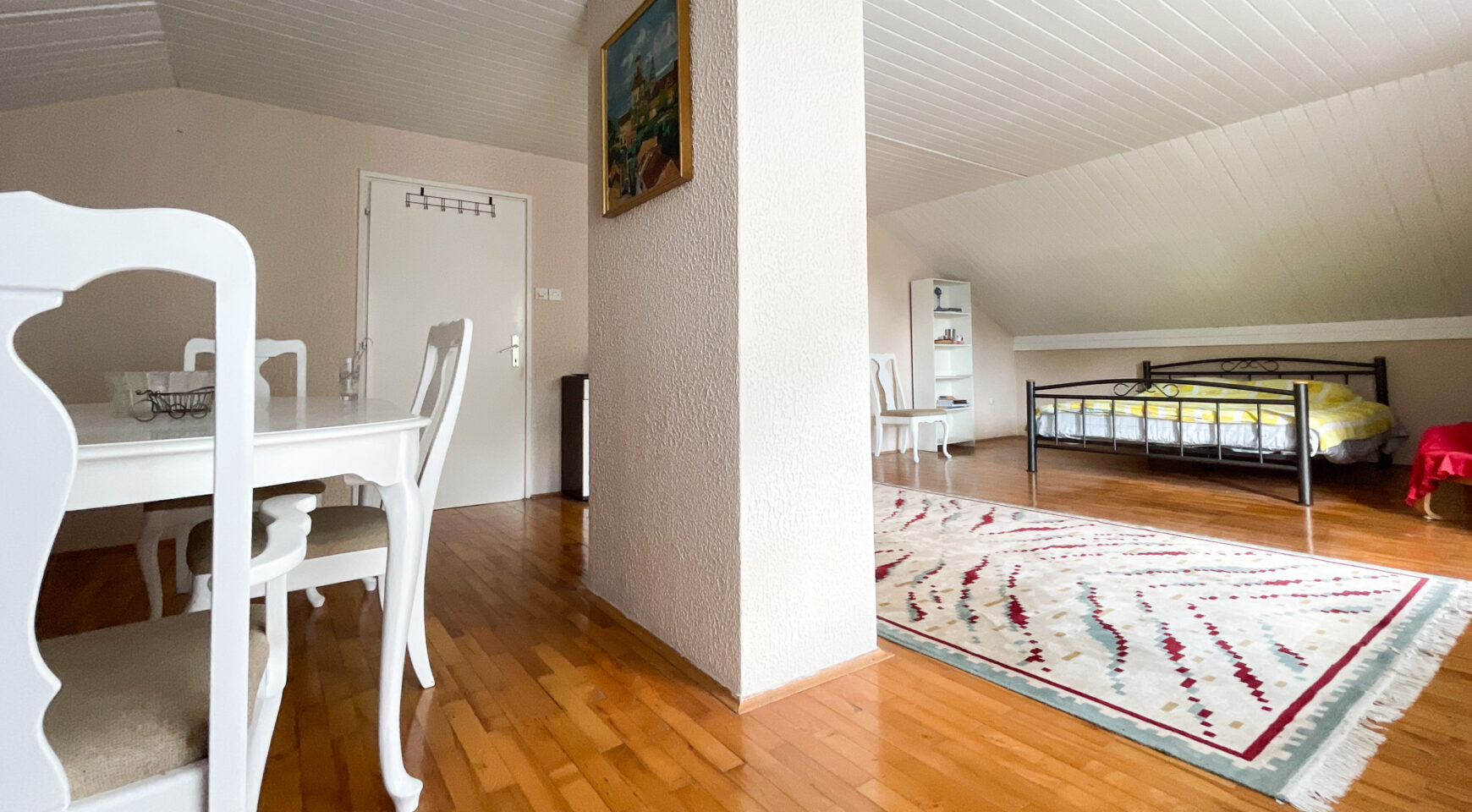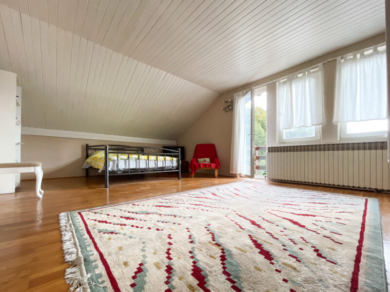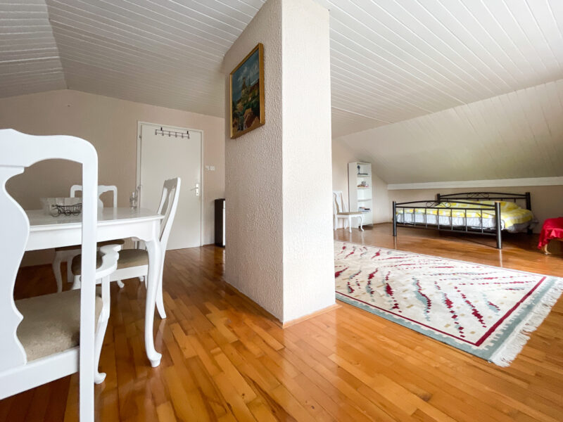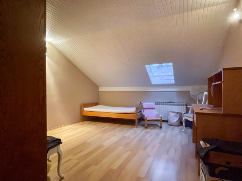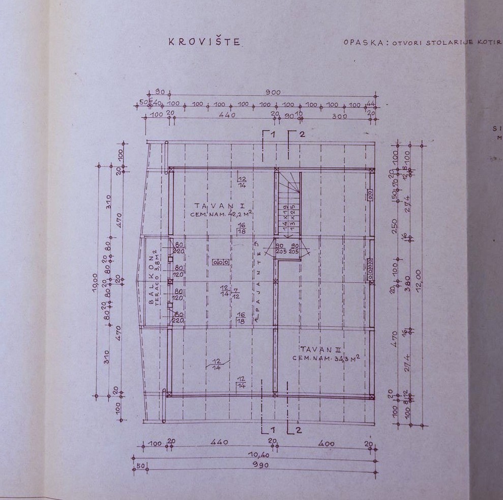 Potkrovlje: hodnik(stepenice), kuhinja, blagovaonica, 2 spavaće sobe i balkon.