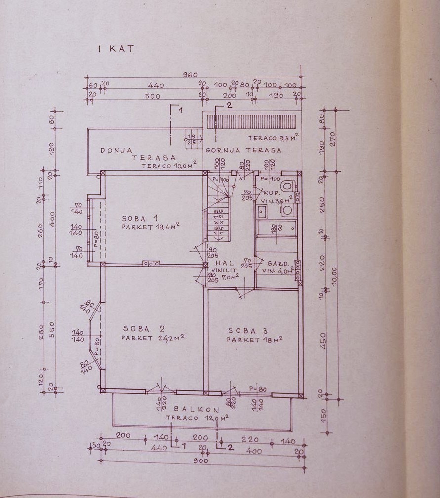 Prvi kat: hodnik(stepenice), vešeraj, kupaonica, dnevni boravak, 2 spavaće sobe i 2 terase;