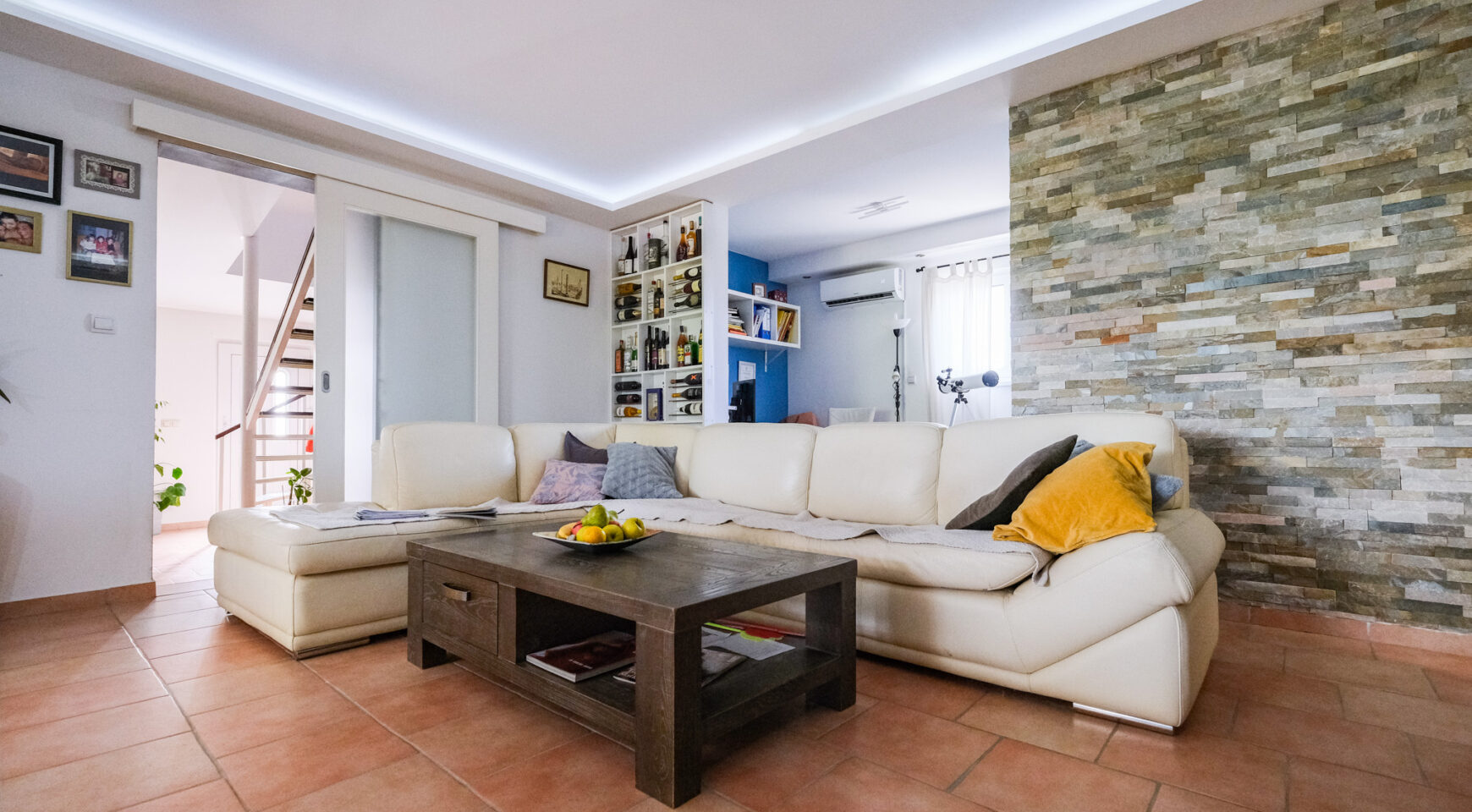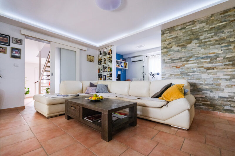 tri klima uređaja. Blago kosi krov s vrhunskom toplinskom izolacijom debljine 3 cm, što osigurava moderan izgled i dodatnu energetsku učinkovitost. Pregradni zidovi su od prirodnog kamena, podovi pločice i parket.