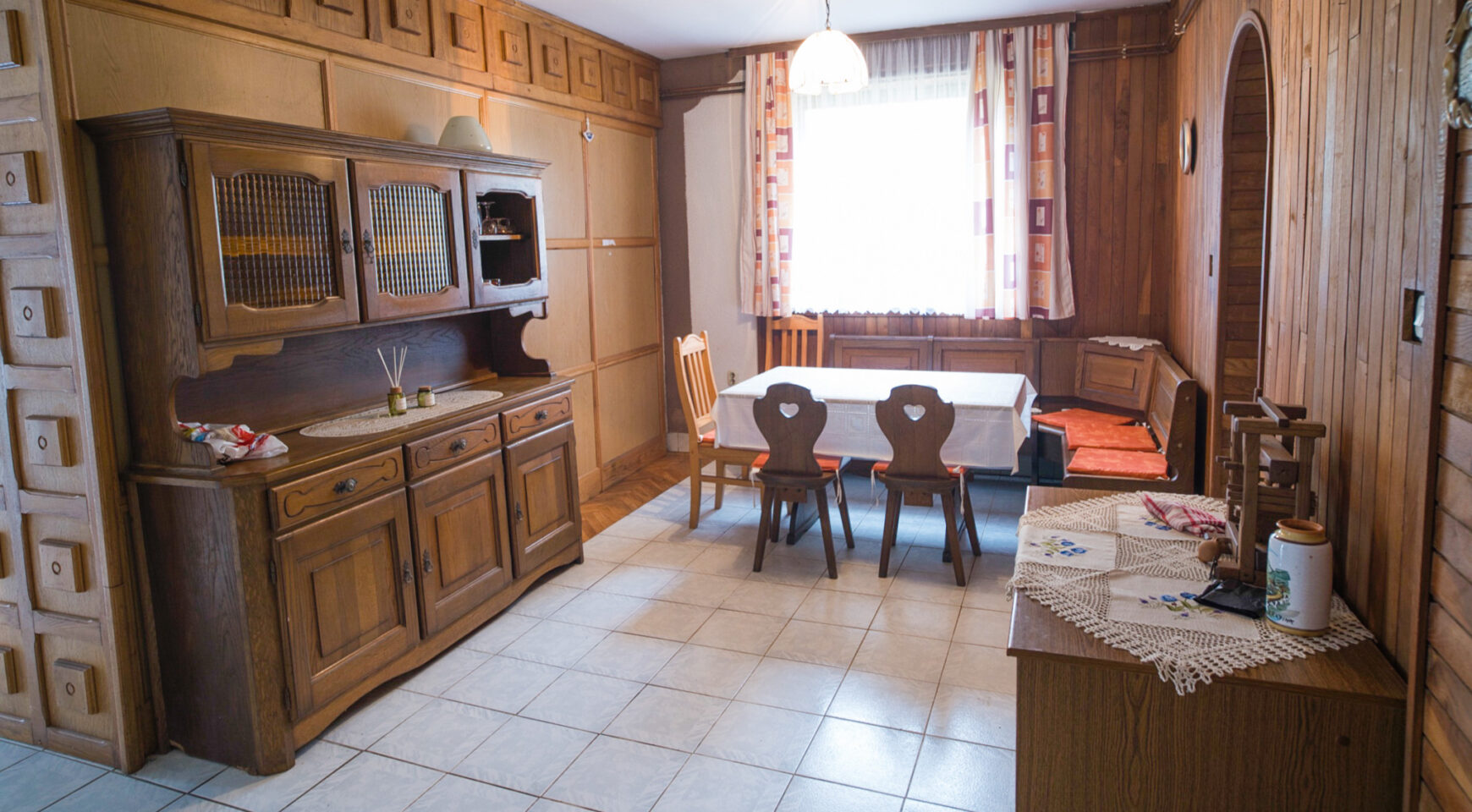 Na katu kuće je smješten dnevni boravak površine 23,0 m2 (na tlocrtu pod br. 13), tri izolirane sobe od 10,7 m2, 18,5 m2 i 11,3 m2 (br. 4, 6 i 7), predsoblje od 8,0 m2 (br. 5), blagovaona od 16,9 m2 (br. 12), kuhinja sa spremištem (br. 10, 9) i velika kupaonica (br. 8). Iz sobe br. 7 se može napraviti ulaz stepenicama gore na tavan i dolje u prizemlje.