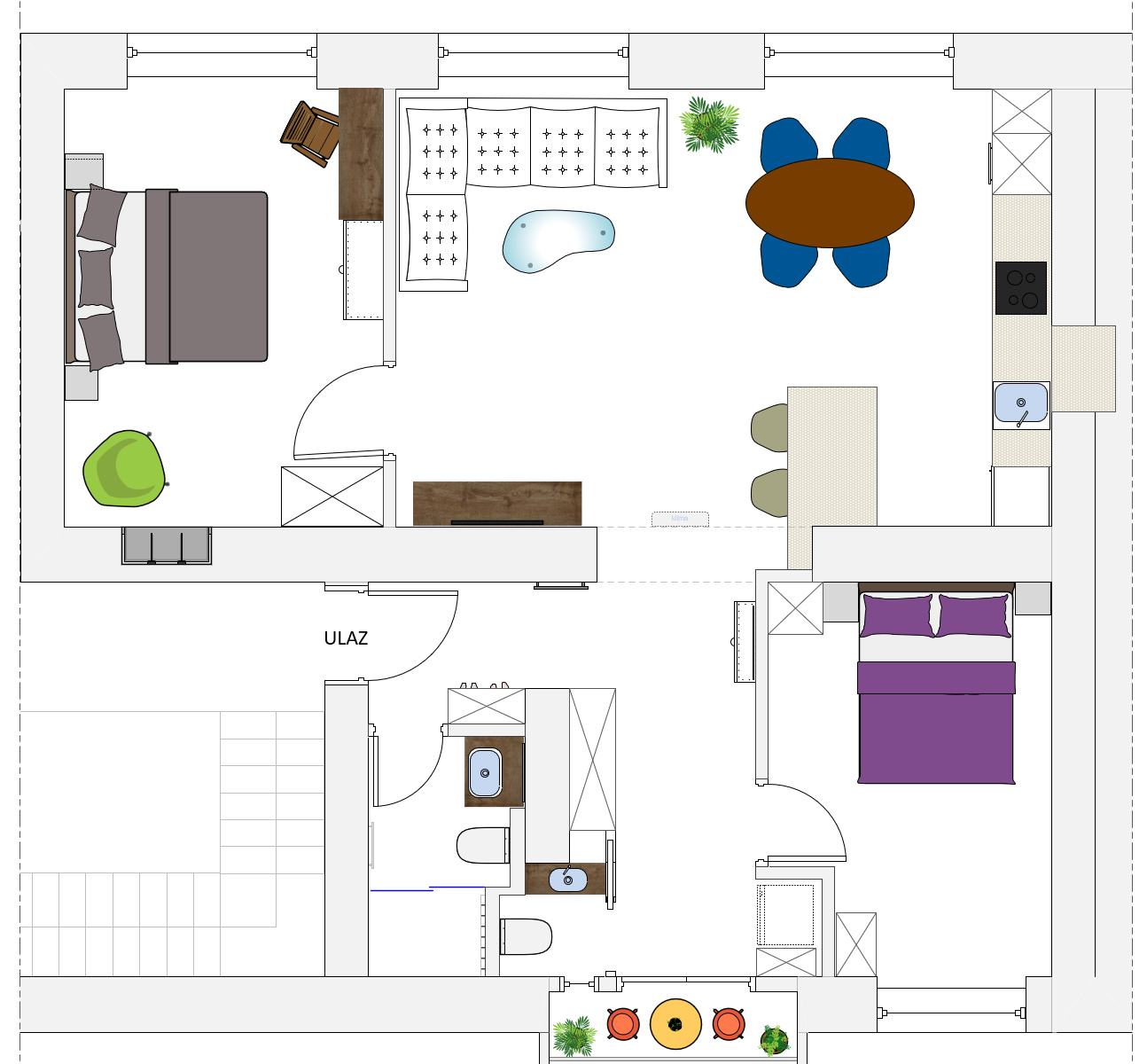 Smješten je u visokom prizemlju, a sastoji se od ulaznog hodnika, dvije sobe, prostranog dnevnog boravka povezanog s blagovaonicom i kuhinjom, kupaonice, zasebnog toaleta te balkona. Tlocrt se nalazi u privitku.