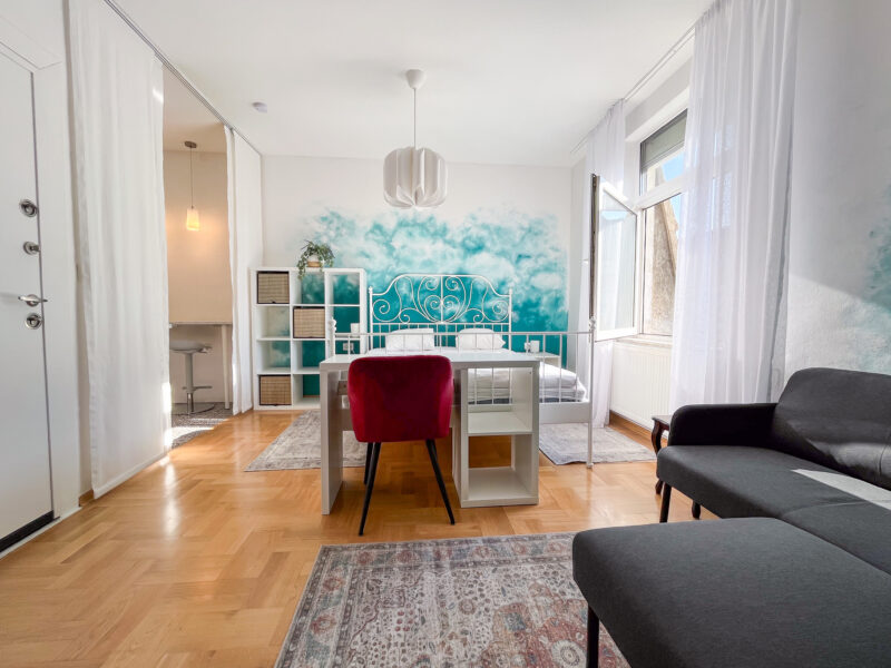 Stan je veoma uredan i svjetao, orijentiran je na zapad. Površine je 27 m2, a sastoji se od sobe, odvojene kuhinje, izdvojene garderobe i kupaonice.