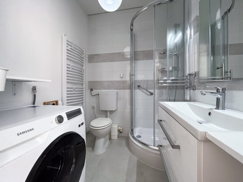 Potpuno je namješten i opremljen – klima uređaj, perilica posuđa, perilica i sušilica rublja, kuhinjska ploča, hladnjak, mikrovalna pećnica, TV, bračni krevet, tuš kabina, PVC stolarija, protuprovalna vrata i sl.