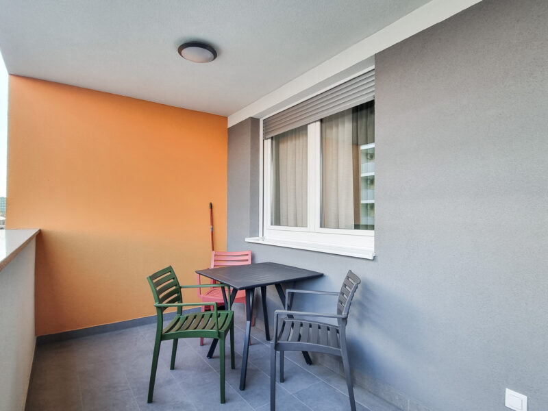 Stan je potpuno namješten, sve je rađeno po mjeri te je prostor odlično iskorišten, a ima i mjesta za donijeti vlastite stvari. Opremljen je klima uređajem, protuprovalnim vratima, PVC stolarijom, ormarima, TV-om, pećnicom, napom, hladnjakom sa zamrzivačem, indukcijskom pločom, video portafonom, udobnim kaučem na razvlačenje, tuš kabinom, toaletom i sl.