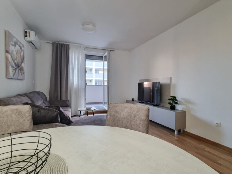 Iznajmljuje se elegantan i moderno uređen 2-soban stan u novogradnji u Lovinčićevoj ulici. Zgrada je izgrađena 2025. godine, a ovaj stan se nalazi na trećem katu.
