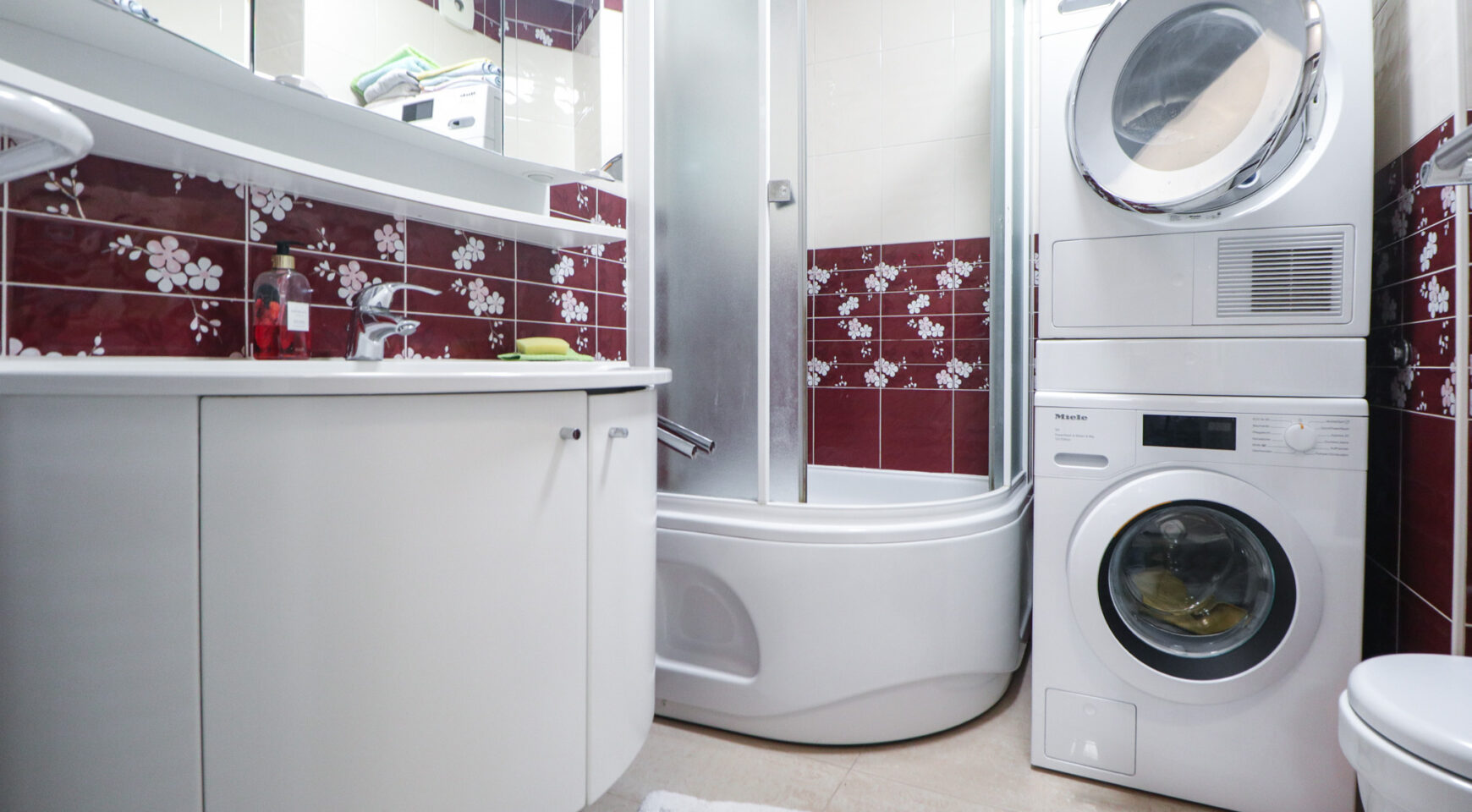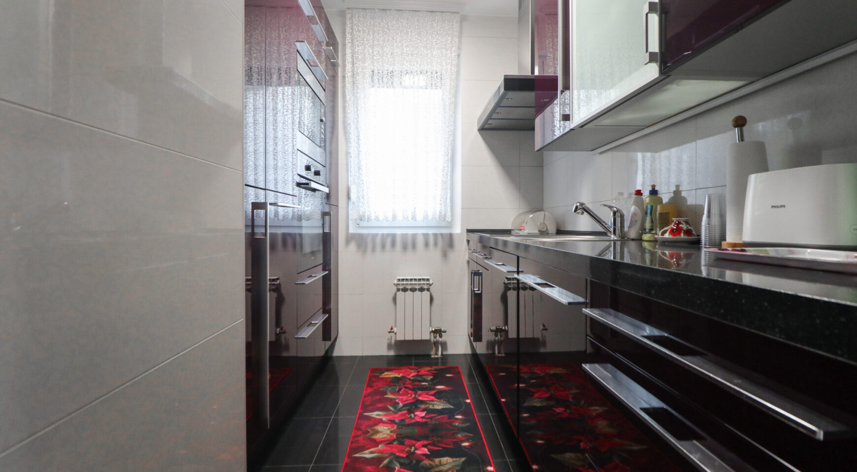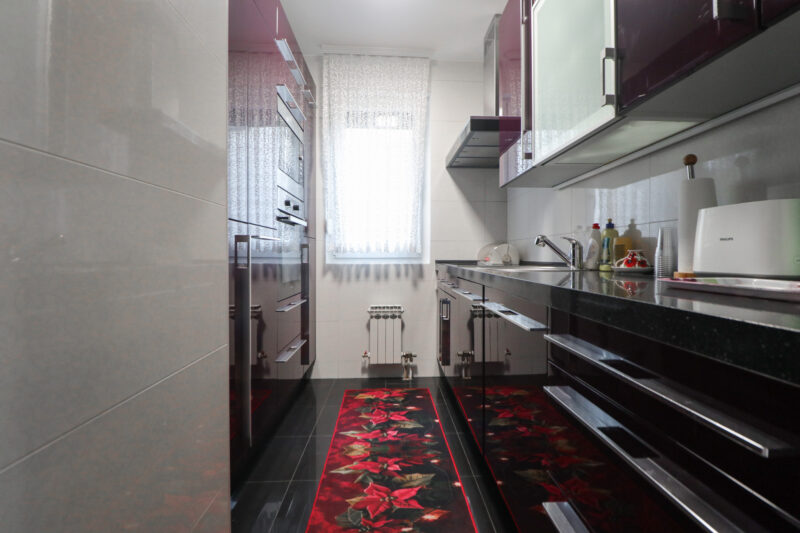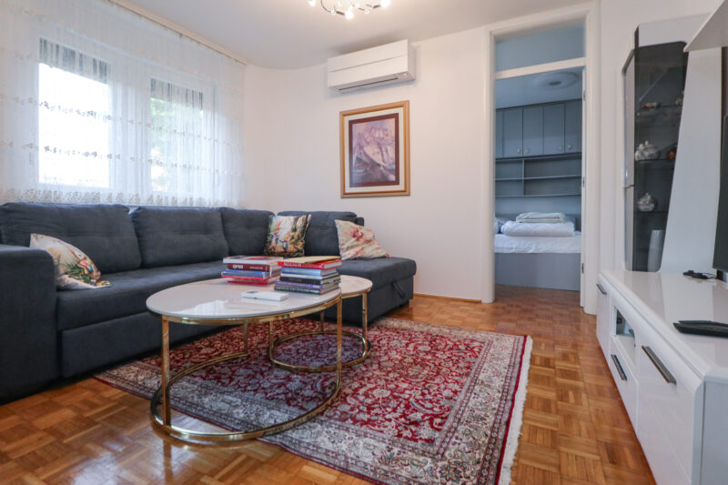 Veoma je uredan i prozračan, orijentiran na sjever i zapad. Površine je 75 m2, a sastoji se od ulaznog hodnika, prostranog dnevnog boravka s blagovaonicom, potpuno opremljene kuhinje, tri spavaće sobe, toaleta, kupaonice te dvije zatvorene lođe. Izlazak na lođe je iz dnevnog boravka i master spavaće sobe. Stanu također pripada i podrumsko spremište.