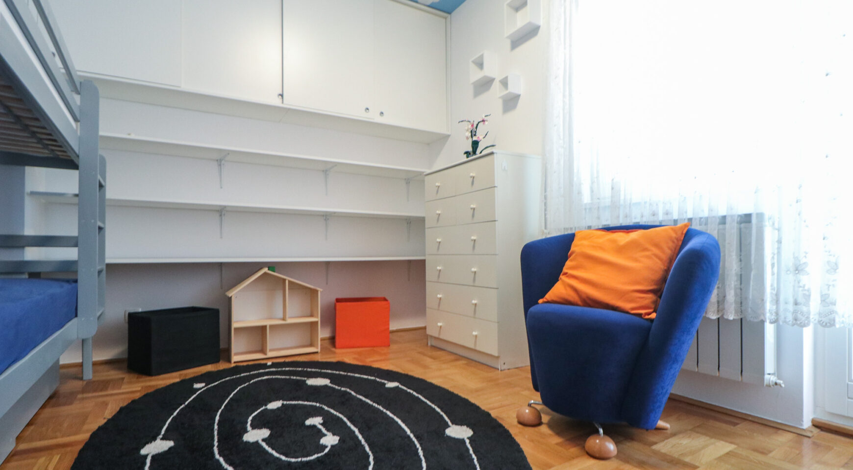 Stan je svjetao i prozračan zbog orijentacije jug – sjever – zapad. Sadrži kupaonicu, gostinjski toalet, prostrani dnevni boravak, potpuno opremljenu kuhinju, blagovaonicu, spavaću sobu, dječju spavaću sobu koja se može i drugačije opremiti po potrebi te dvije lođe. Izlazak na lođe je iz dnevnog boravka i sobe. Ukupna površina je 82 m2 i odličnog je rasporeda, hodnik potpuno odvaja dnevni boravak od spavaćih soba.