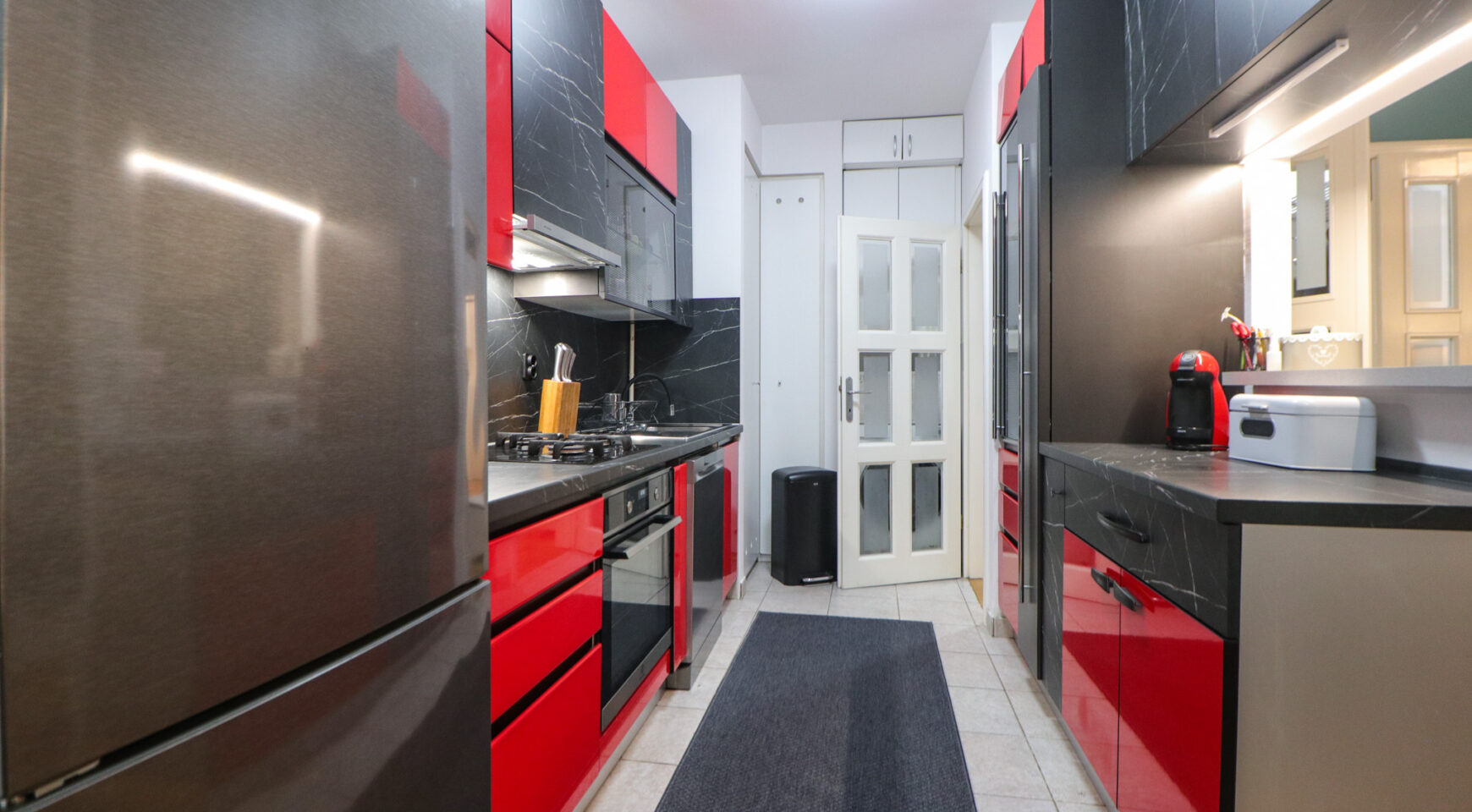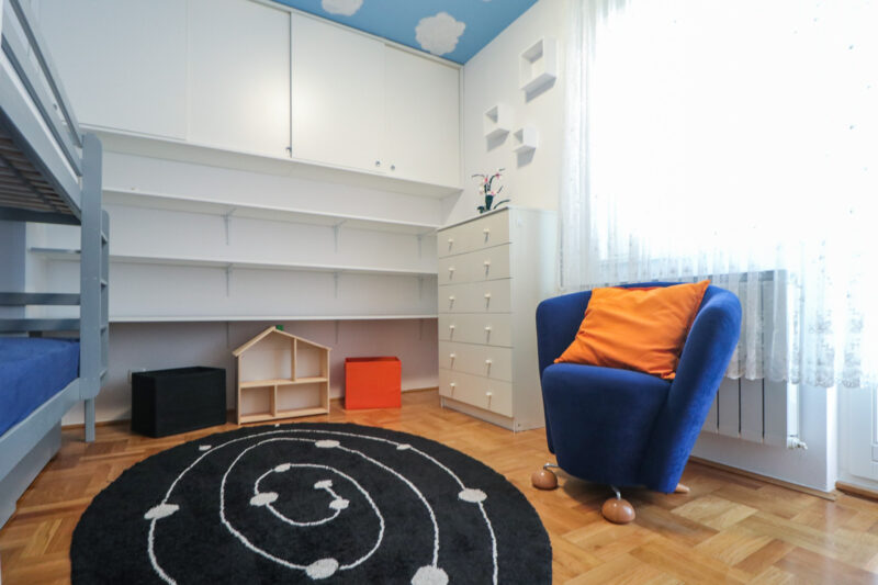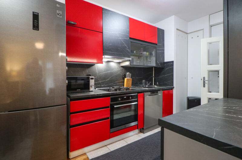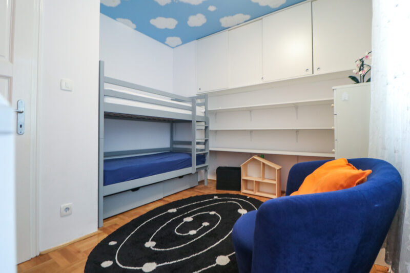 Kompletno je namješten i u cijelosti opremljen – klima uređaj, video projektor, perilica posuđa, perilica rublja, hladnjak sa zamrzivačem, pećnica, 3+1 štednjak, napa, mikrovalna pećnica, aparat za kavu, čaše & posuđe, bračni krevet, dječji krevet na kat, kauč, blagovaonski stol, radni stol, video portafon, protuprovalna vrata, PVC stolarija, alarmni sistem, itd. Prostor je odlično iskorišten ugradbenim ormarima i ormarićima, a u kuhinji je ugrađena i manja ostava.