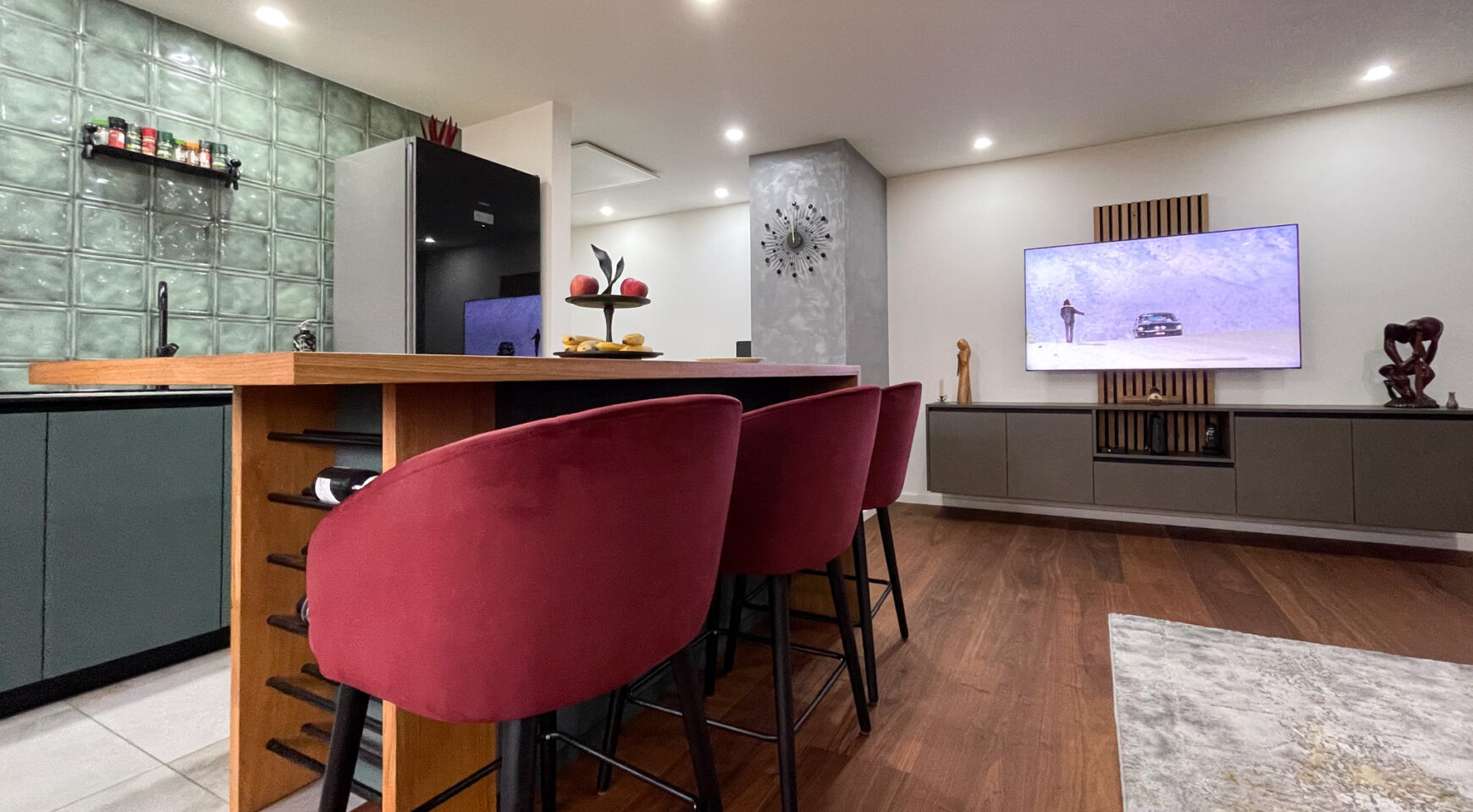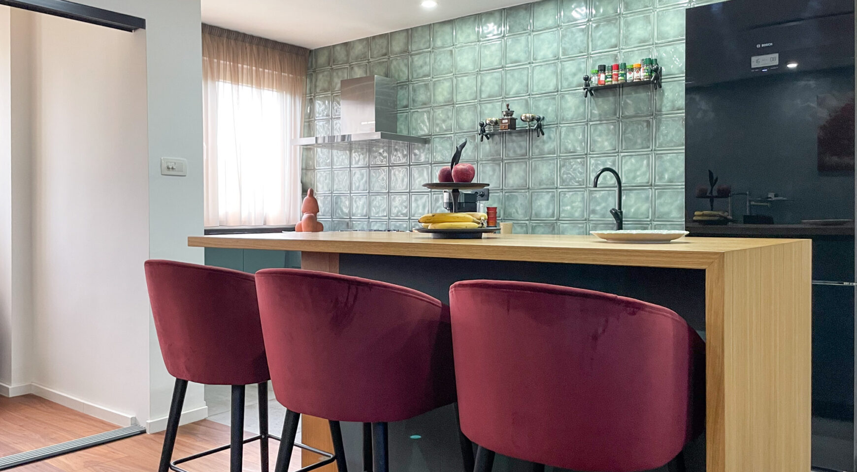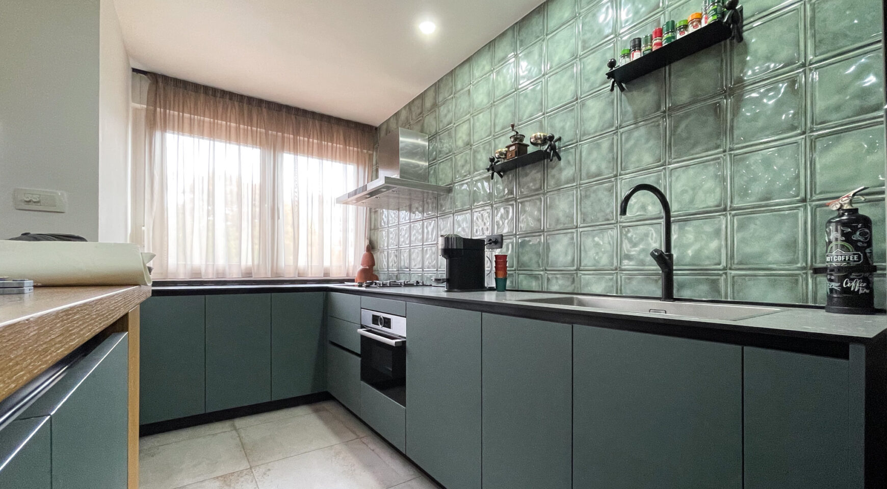 Kuhinja je izrađena od vrhunskog materijala s otpornom radnom pločom, i opremljena je Bosch aparatima (indukcija, selektivni plin, napa, parna pećnica, perilica suđa, hladnjak i aparat za kavu – svi pod garancijom). Nasuprot kuhinje nalazi se otok za blagovanje s poluvisokim stolicama i foteljama presvučenima u AquaClean tkaninu, jednako kao i BoxSpring kreveti u spavaćim sobama, što prostoru daje dojam profinjene harmonije i jednostavnog održavanja.