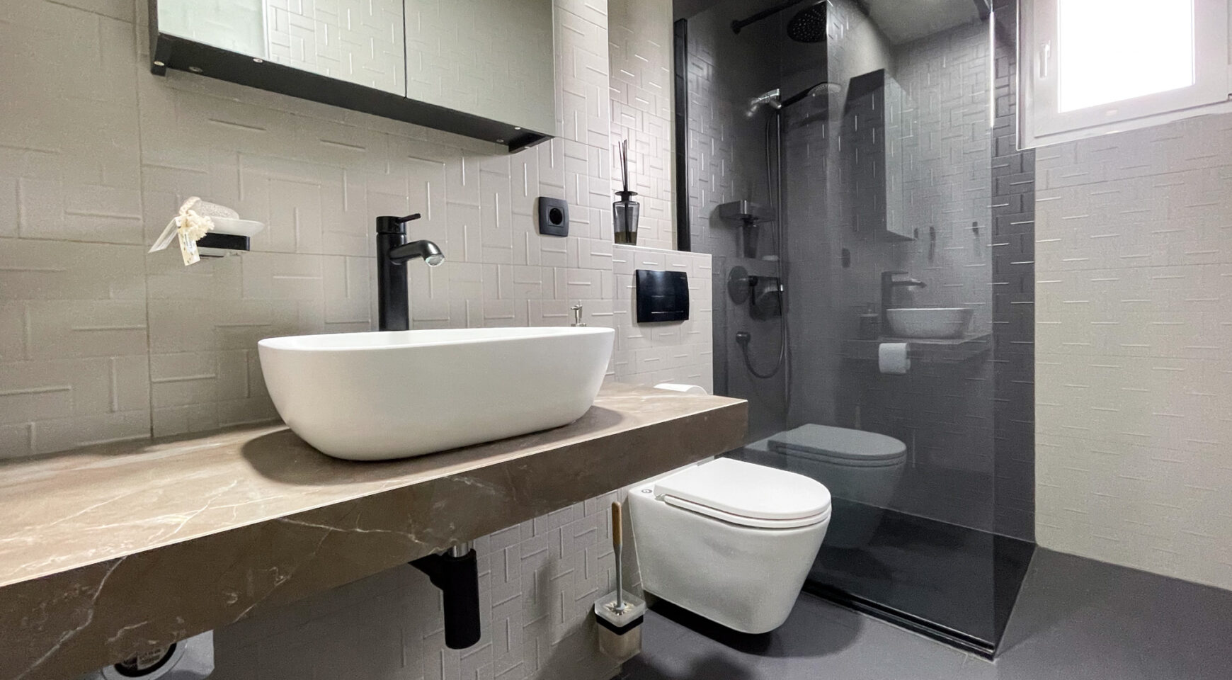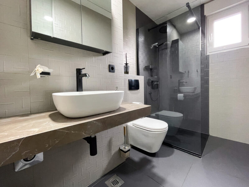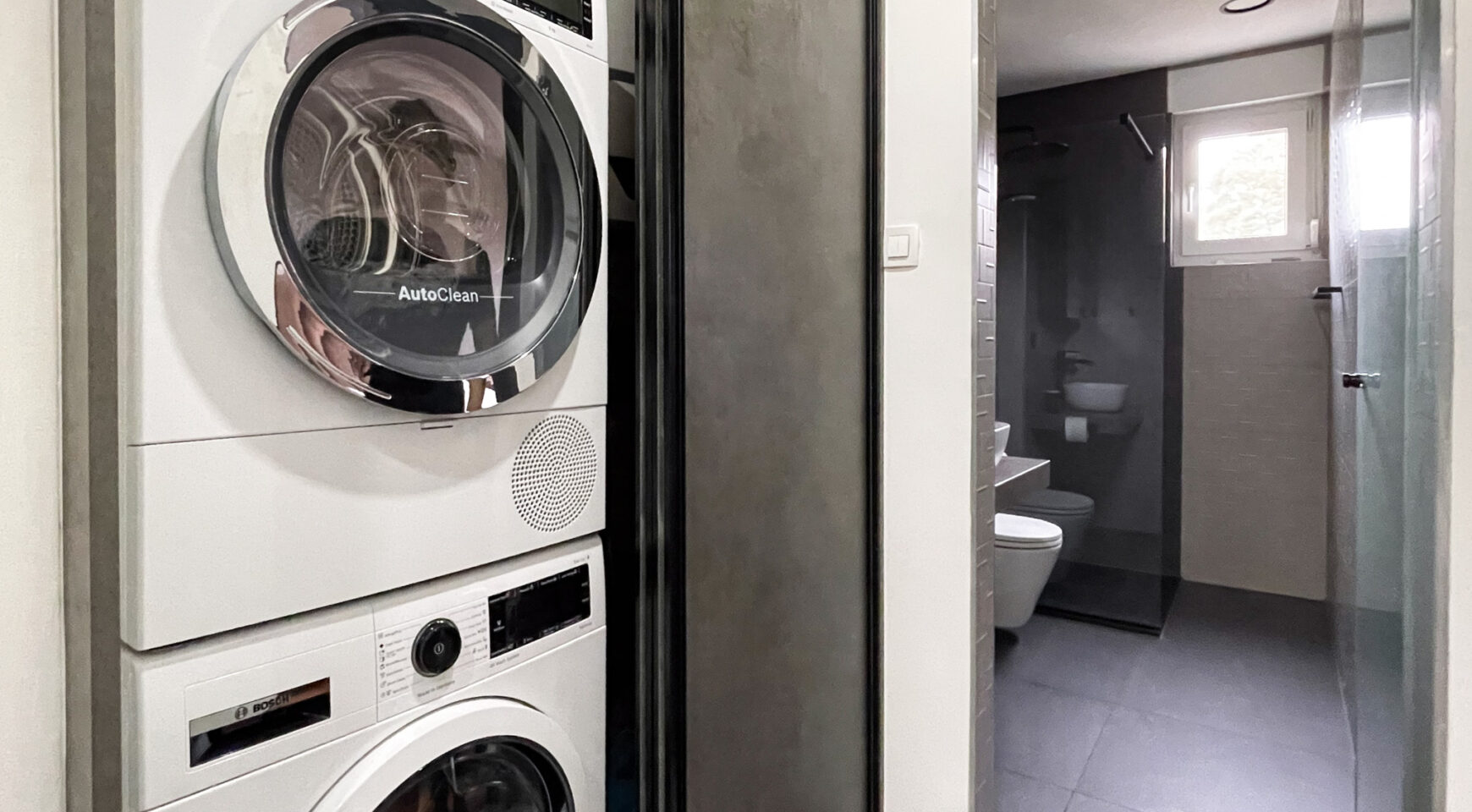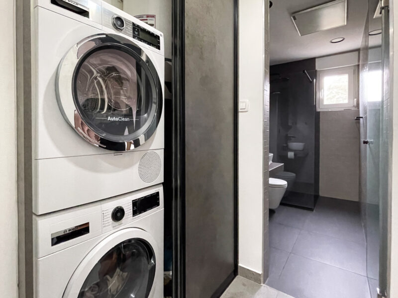 Kupaonica je uređena s vrhunskim elementima, s porculanskom pločom po mjeri, akrilnim umivaonikom, lijevanim mramorom u tuš prostoru i 3D porculanskim oblogama. U hodniku se nalazi Bosch perilica i sušilica rublja, dok protuprovalna vrata treće razine osiguravaju potpunu sigurnost.