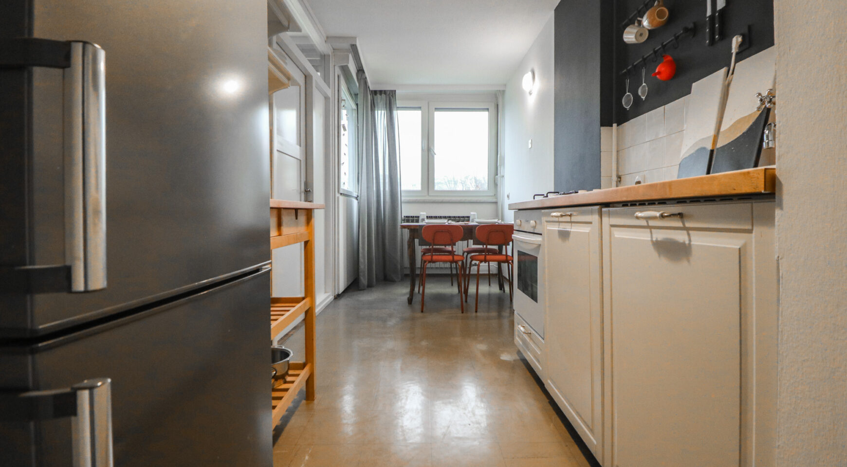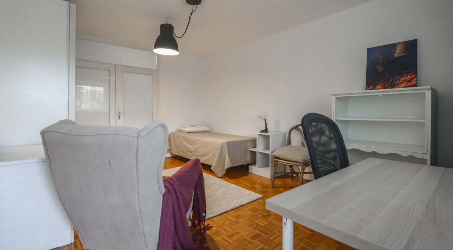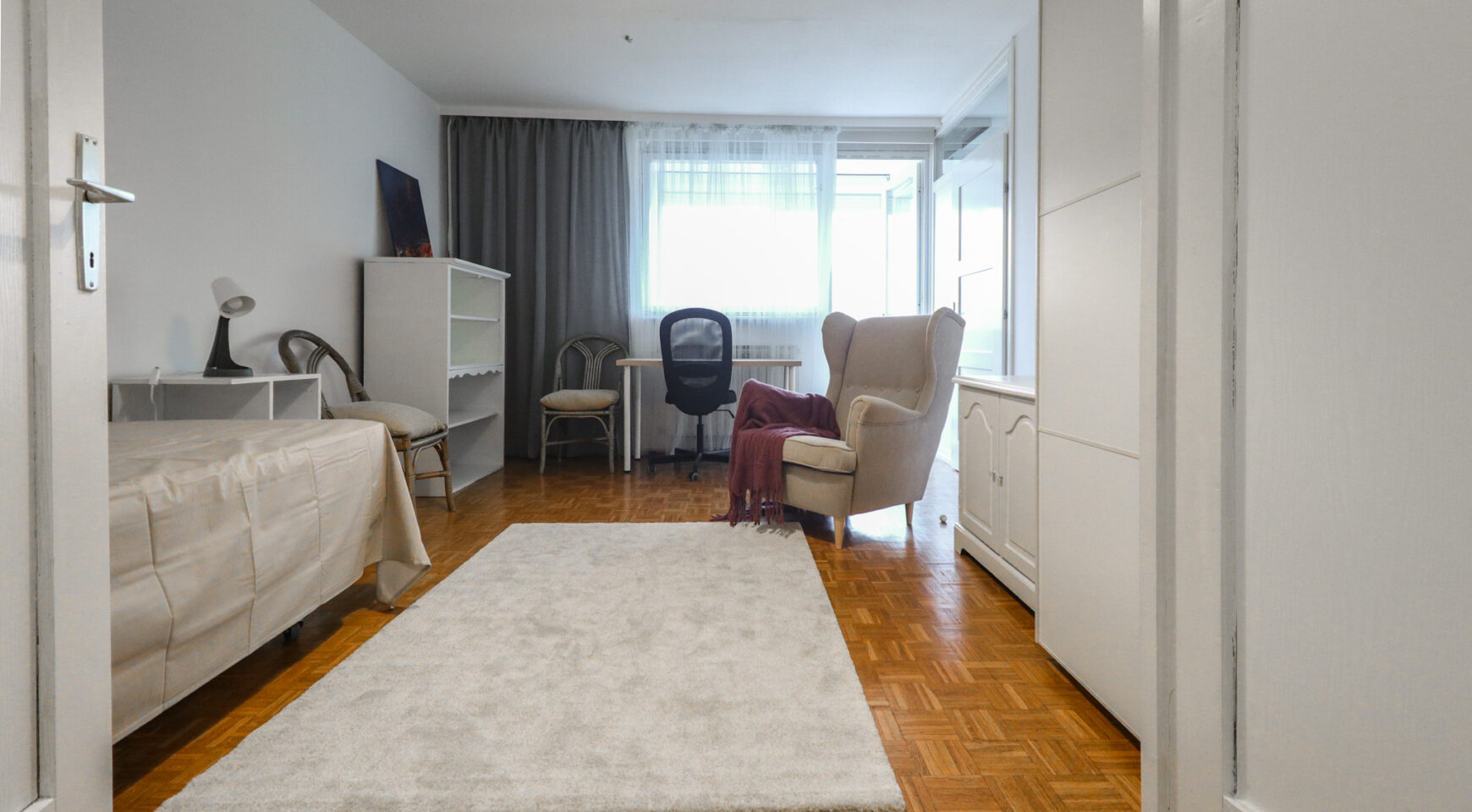 Stan je površine 65 m2, potpuno je čist i lijepo uređen. Svjetao je i topao jer je orijentiran na zapad. Svaka prostorija je lijepe veličine, a raspored stana se po potrebi može i promijeniti (sada stan idealno funkcionira za dva cimera-sobe su namještene krevetime, ormarima i radnim stolom i stolicom, a po potrebi se jednu sobu može prenamijeniti u dnevni boravak).