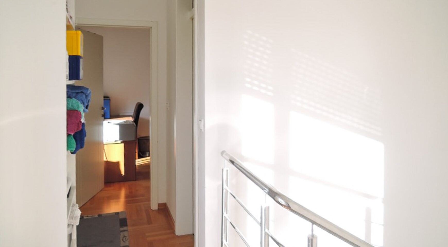 Stan je svjetao, topao i dobrog rasporeda. Površine je 92 m2. DONJA ETAŽA: hodnik, dnevni boravak, kuhinja, kupaonica, dvije spavaće sobe GORNJA ETAŽA: spavaća soba, kupaonica, terasa, loggia. Tlocrt se nalazi u privitku.