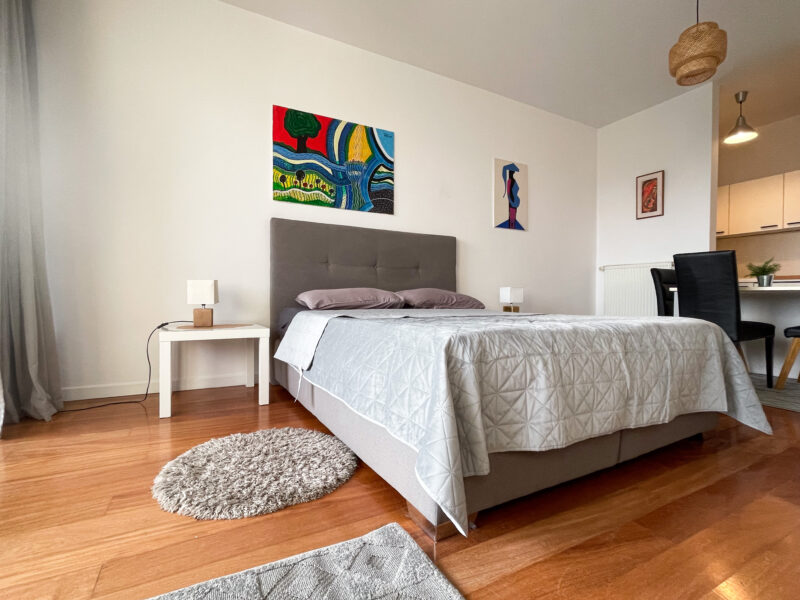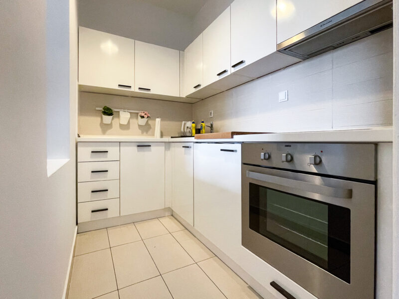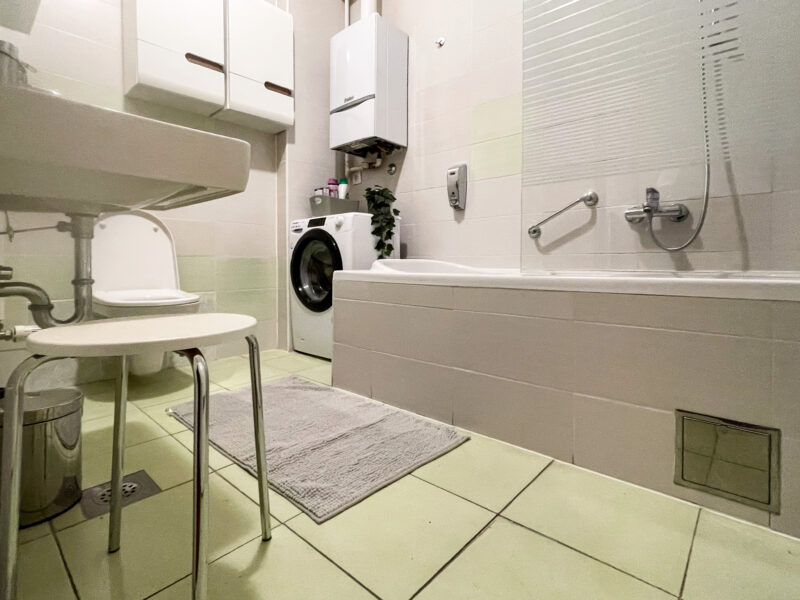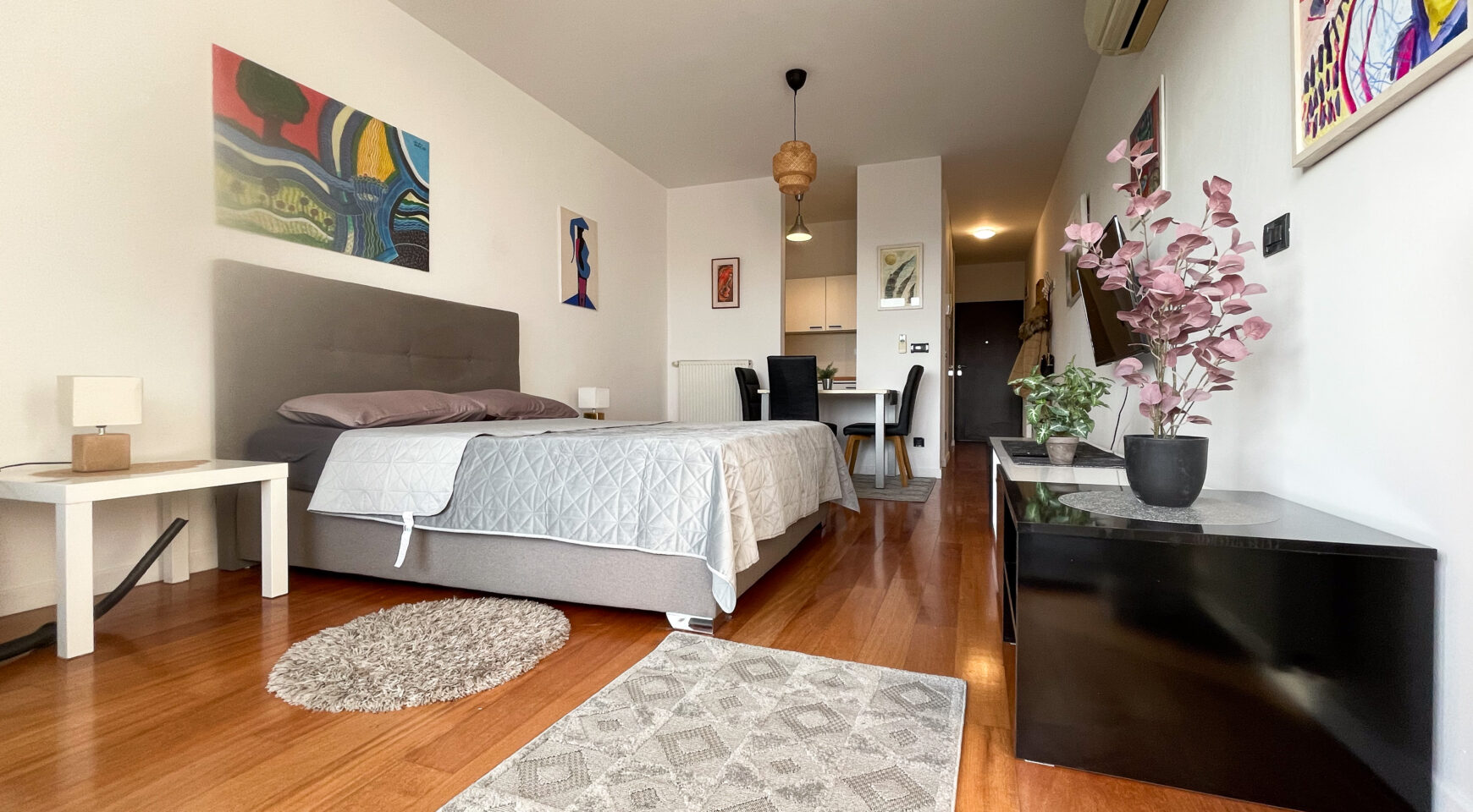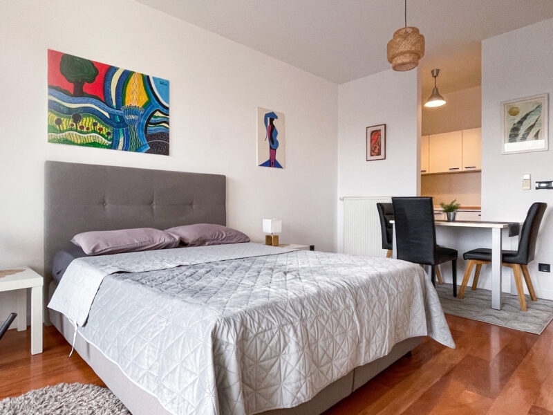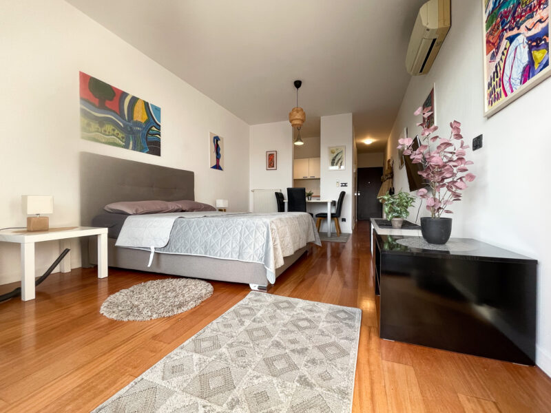 Stan se nalazi na 5. katu moderne zgrade s liftom (ukupno 8 katova), a zahvaljujući promišljenom uređenju, pruža osjećaj luksuza i topline već pri samom ulasku. Interijer je dizajniran tako da svaki kvadrat ima svoju svrhu, elegantan ulazni hodnik s ugradbenim ormarima po mjeri, moderno uređena kupaonica s kadom, perilicom rublja i profinjenim detaljima, opremljena kuhinja spremna za svakodnevnu upotrebu te otvoreni dnevno-spavaći prostor s udobnim bračnim krevetom 160 × 200 cm, pažljivo biranim namještajem, TV-om i blagovaonskim kutkom.