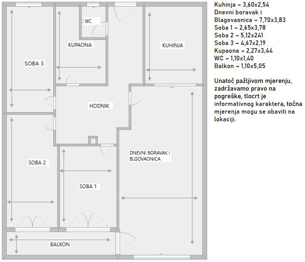 Stan ima ulazni hodnik, prostrani dnevni boravak povezan s blagovaonicom i novom kuhinjom, tri spavaće sobe, kupaonicu s kadom i toaletom, gostinjski WC te loggiu površine 5,5 m2 na koju se izlazi iz dvije sobe.