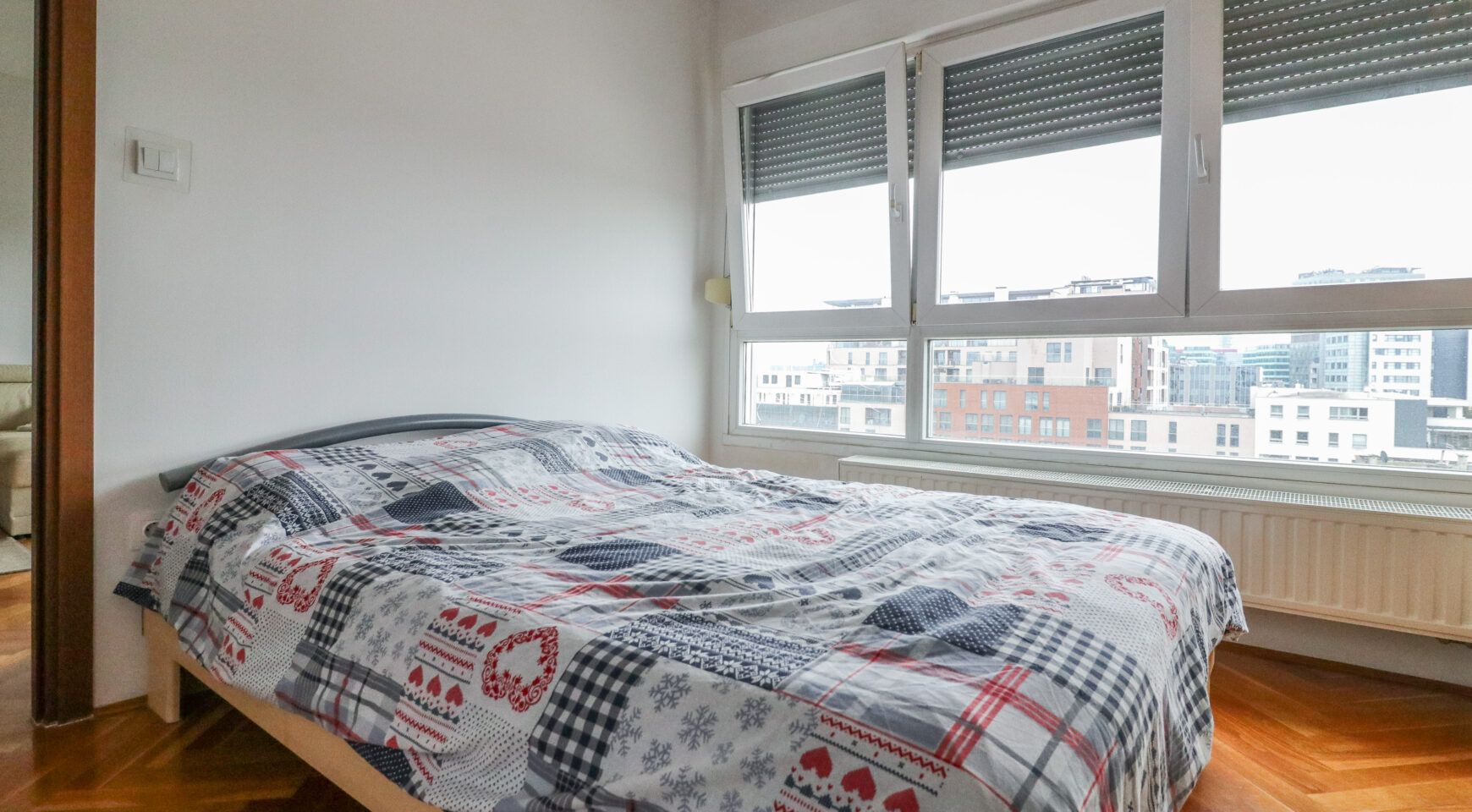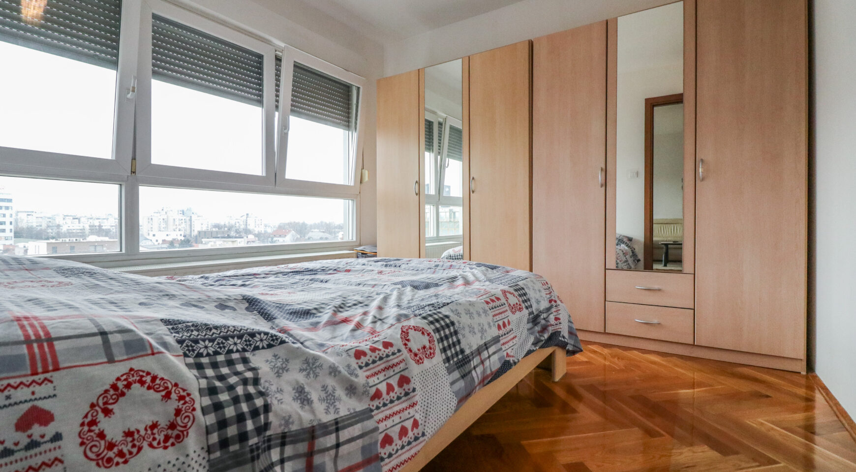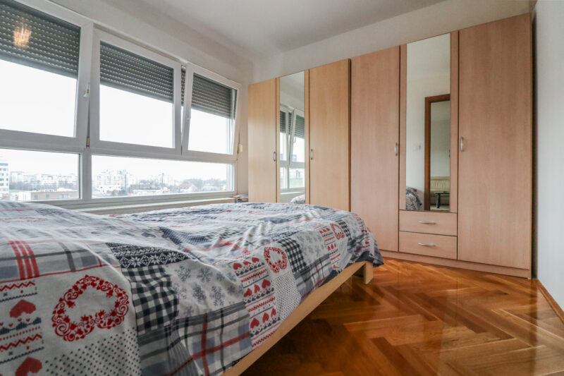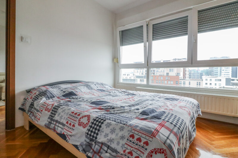 Stan je iznimno prozračan i svijetao što može zahvaliti velikim staklenim stijenama, odličnoj orijentaciji istok-juga i visokoj katnosti. Stoji se od ulaznog hodnika, kupaonice, dvije spavaće sobe te dnevnog boravka koji je spojen s blagovaonskim dijelom i kuhinjom. (Inicijalno se radilo o dvosobnom stanu koji je imao prostranu spavaću sobu, te je sada taj prostor elegantno podjenjen na dva dijela kako bi se dobile dvije spavaće sobe).