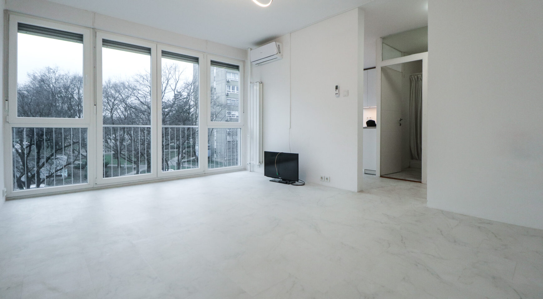 Stan je nov, dobrog rasporeda, pun svjetla i na dobroj lokaciji. Orijentiran je na zapad i cijelom dužinom obložen staklenim stijenkama stoga je veoma svjetao i toploga dojma. Površine je 32 m2, a sastoji se od ulaznog hodnika, kupaonice, kuhinje te velike sobe.