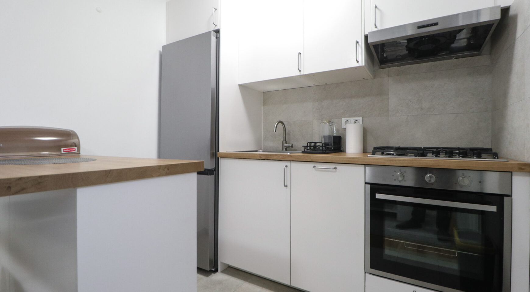 U cijelosti je namješten i opremljen perilicom posuđa, perilicom rublja, Samsung hladnjakom sa zamrzivačem, pećnicom, štednjakom, napom, Smart TV-om, optičkim internetom, smart lock i sigurnosnim sistemom na ulazu, termostatom, tuš kabinom, toaletom, bideom, PVC stolarijom, kaučem, krevetima dimenzija 140 cm, trokrilnim ormarima u sobama, noćni ormarićima, radnim stolovima itd.